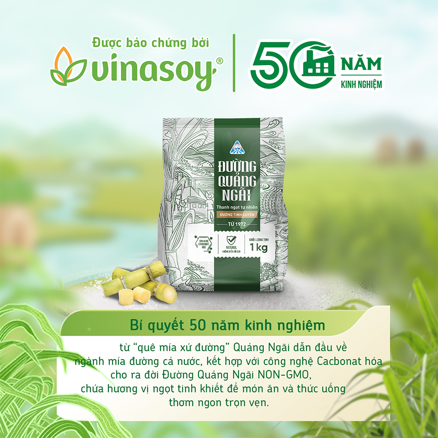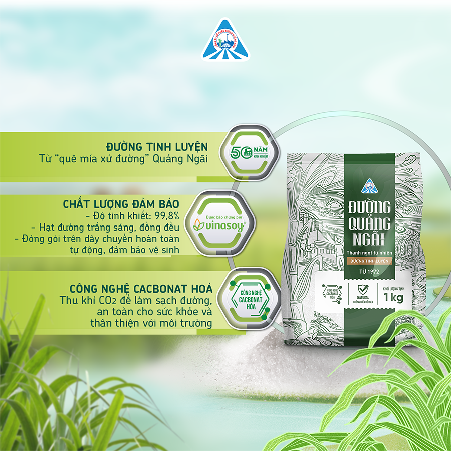 - Đường tinh luyện Quảng Ngãi khởi nguồn từ "cái nôi của mía đường" Quảng Ngãi, trong suốt 50 năm qua, trên vùng nguyên liệu mía Tây Nguyên trù phú, mọi tinh túy ngọt ngào từ tự nhiên đã được chắt lọc và tiếp nối để kết tinh thành những hạt đường Quảng Ngãi "thanh ngọt tự nhiên".