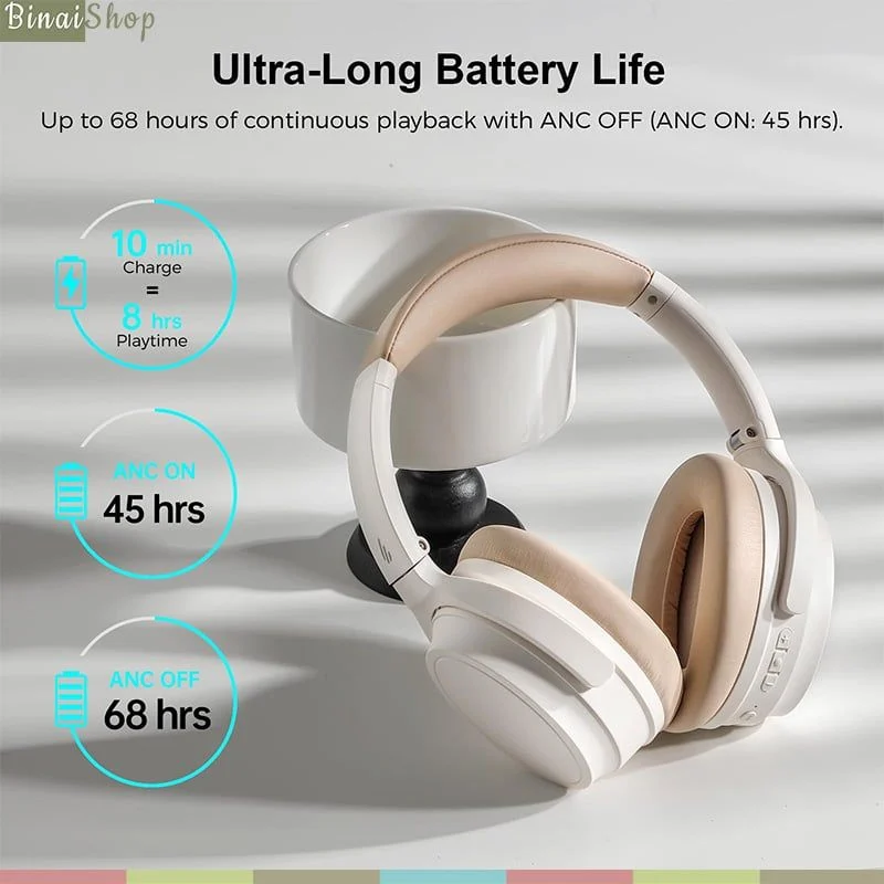 - Tai nghe Edifier WH700NB thiết kế nhỏ gọn cùng chức năng gấp hoàn toàn giúp nâng cao tính di động, thời lượng pin dài lên đến 68 giờ (phát nhạc thông thường), 45 giờ đói với ANC, kết