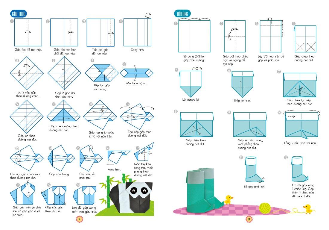 Với từng quyển, bé sẽ học cách gấp những đồ vật, con vật đơn giản nhất, từ phong bao, củ cà rốt… đến những hình phức tạp với nhiều đường gấp, cần nhiều sự tưởng tượng hơn như con cua, giỏ đựng hoa quả, lạc đà... Mỗi trang sách là những hướng dẫn tỉ mỉ, bé chỉ cần làm lần lượt theo các bước. Cuối cùng, bé đã có một sản phẩm hoàn thiện với màu sắc sống động, ngộ nghĩnh.