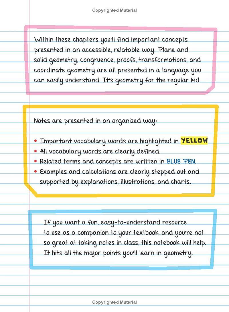 This Big Fat Notebook covers everything you need to know during a year of high school geometry class, breaking down one big bad subject into accessible units. Learn to study better and get better grades using mnemonic devices, definitions, diagrams, educational doodles, and quizzes to recap it all.