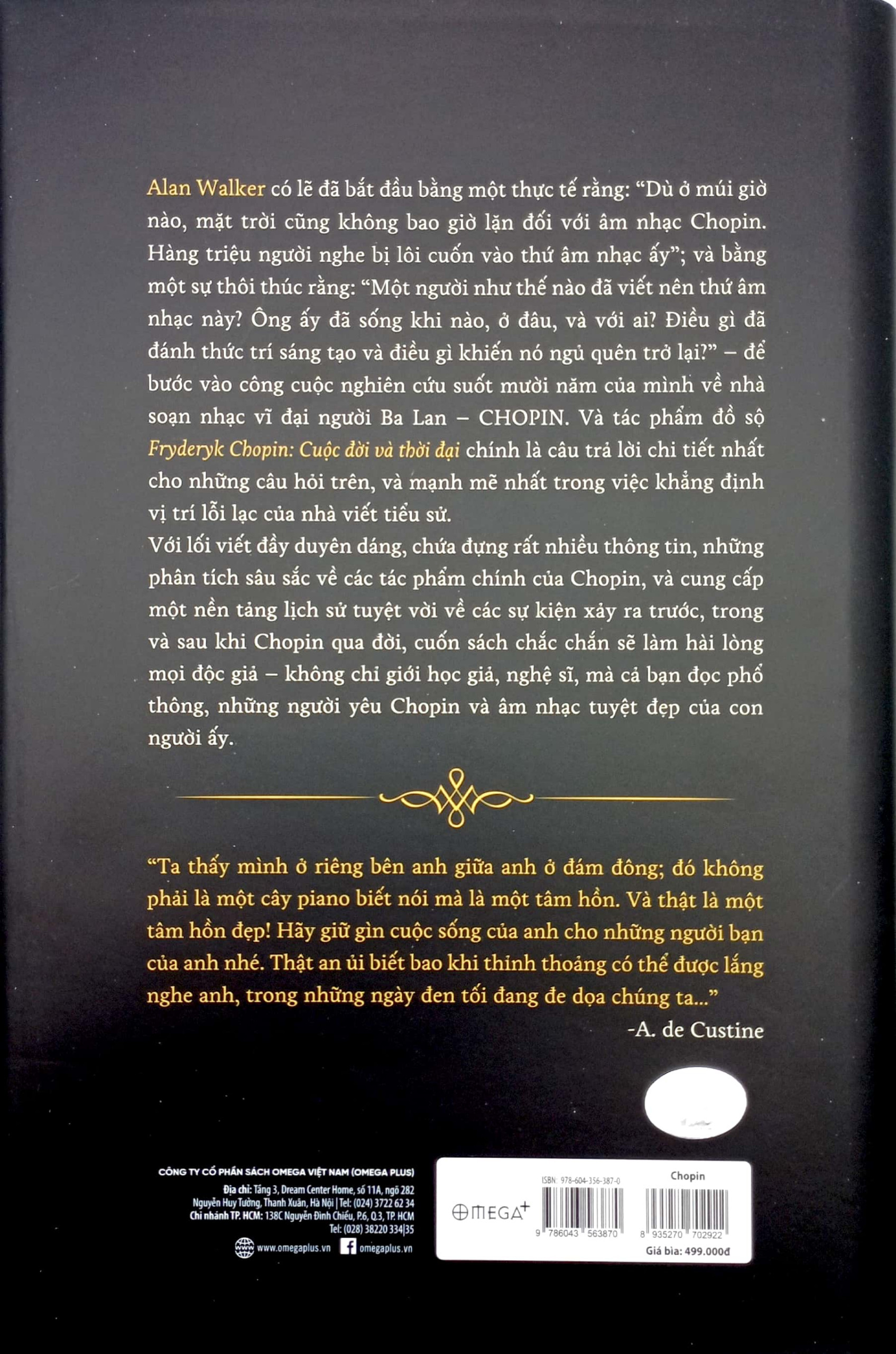 - Điểm nhấn: kết quả của trên 10 năm nghiên cứu ĐÁNH GIÁ/NHẬN XÉT CỦA CHUYÊN GIA Một cuốn tiểu sử lý tưởng về một nhà soạn nhạc chứa đựng những phẩm chất: kiến thức sâu sắc về cuộc đời và hoàn cảnh của người nghệ sĩ, được củng cố bằng việc khảo sát lại tất cả các nguồn sẵn có; sự hiểu biết sâu sắc về tính cách của nhà soạn nhạc (và đôi khi có thể là những tình cảm dành cho tính cách ấy); và khả năng diễn đạt công việc sáng tạo theo cách sẽ gây ấn tượng với cả học giả và công chúng, đồng thời đưa tất cả chúng ta trở lại với âm nhạc. Fryderyk Chopin: A Life and Times của Alan Walker thực sự đã đạt được những điều trên. Đây hiện là cuốn tiểu sử hay nhất của Chopin - tỉ mỉ, uyên bác và được kể theo cách hay nhất. " -- Tim Page, The Washington Post TRÍCH ĐOẠN HAY Tôi muốn khẳng định một điều dù không thể chứng minh nhưng tôi chắc chắn đúng. Trong bán kính năm mươi km từ nơi tôi đang viết Lời mở đầu này, một người nào đó ở đâu đó đang chơi hoặc nghe nhạc Chopin. Nó cũng không phụ thuộc vào vị trí bàn viết của tôi — hiện được đặt gần Toronto. Chuyển nó đến New York, London, Berlin, Vienna, Moscow hoặc Bắc Kinh, và điều khẳng định ấy vẫn sẽ đúng. Dù ở múi giờ nào, mặt trời cũng không bao giờ lặn đối với âm nhạc Chopin. Hàng triệu người nghe bị lôi cuốn vào nó. Các đài phát thanh trên khắp thế giới phát sóng các sáng tác của ông. Doanh số các bản thu âm nhạc Chopin vẫn giữ vững phong độ, ngay cả khi những nhà soạn nhạc khác mất đi sự ái mộ. “Độc tấu Chopin” càng ngày càng được yêu thích, một kịch mục cố định trong phòng hòa nhạc. Các cuộc thi Chopin liên tục xuất hiện trên toàn cầu. Cuối cùng, và đáng chú ý nhất, Chopin đã trở thành biểu tượng của một quốc gia. Ông là người con trai lỗi lạc nhất của Ba Lan. Có nhà soạn nhạc nào khác mà người ta có thể nói về bằng những điều tương tự? Bữa tối được phục vụ vào lúc 5 giờ chiều và sau khi kết thúc, thời gian buổi tối có thể được dành cho việc giải trí. Sand thường có khách khứa đến chơi và khi không khí sau bữa ăn trở nên đặc biệt thoải mái, không khó để thuyết phục Chopin chơi piano và thậm chí chọc cười khán giả với những màn bắt chước nổi tiếng của mình. Sau khi mê hoặc họ với màn biểu diễn piano, anh cố ý phá bỏ sự quyến rũ anh vừa tạo ra. Liếc qua gương, anh chỉnh lại cà vạt, làm rối mái tóc, làm vài điệu bộ tương ứng khiến khán giả phải bật cười với màn bắt chước của mình, theo như lời của Sand “một người Anh lạnh lùng, một người già lạc lõng, một quý bà Anh đa cảm hoặc một tay Do Thái hám lợi. Họ thuộc kiểu đáng thương nhưng hài hước và được thể hiện hoàn hảo đến nỗi mọi người bị thu hút vào màn đó của anh ấy mà không biết chán”. Chính Chopin là người bắt đầu truyền thống diễn kịch và kịch câm ở Nohant với những màn diễn được ứng biến và có đủ vai cho bất kỳ ai muốn tham gia. Các trò giải trí này cuối cùng đã truyền cảm hứng cho Maurice Sand lập nên Nhà hát múa rối Nohant, với dàn nhân vật được lấy ra từ các vở hài kịch ứng tác cũ (commedia del,l’arte) - trong số đó có Arlecchino, Pantalone, Il Dottore và Zanni. Việc sáng tác của anh ấy rất ngẫu hứng, kỳ diệu. Anh ấy có được những ý tưởng mà không phải tìm kiếm chúng, không cần dự đoán về chúng. Chúng đến trên cây đàn piano của anh, bất chợt, hoàn thiện, tuyệt mỹ hoặc ngân lên trong đầu khi anh đi dạo và anh phải chạy vội về, quăng mình vào cây đàn để bản thân lắng nghe chúng. Nhưng sau đó sẽ bắt đầu một quá trình lao động đau lòng hơn mọi thứ tôi đã từng chứng kiến. Đó là một chuỗi những nỗ lực để nắm bắt lại một số chi tiết nào đó của các chủ đề mà anh ấy vừa nghe trong sự bất lực và thiếu kiên nhẫn: những gì anh ấy hình dung về tổng thể được phân tích quá mức trên giấy và sự lo ngại việc ghi chép lại không đầy đủ (theo như ý anh ấy) đã ném anh vào sự tuyệt vọng. Anh giam mình trong phòng cả ngày, rên rỉ, đi lại, bẻ gãy bút, lặp lại hoặc thay đổi ô nhịp hàng trăm lần, liên tục viết ra rồi lại xoá đi và làm lại từ đầu vào ngày hôm sau với sự tỉ mỉ và kiên nhẫn kinh khủng. Anh mất sáu tuần cho một trang nhạc, chỉ để trở lại và viết những gì anh có trong bản nháp đầu tiên. THÔNG TIN THÊM Cuốn sách nhạc cổ điển của năm 2018 do tờ The Sunday Times (Vương quốc Anh) bình chọn. Một trong những Sách hay nhất năm 2018 do tờ The Economist bình chọn VỀ TÁC GIẢ Alan Walker Ông là Giáo sư danh dự tại Đại học McMaster từ năm 1995; Tiến sĩ Walker được phong làm Thành viên của Hiệp hội Hoàng gia Canada vào năm 1986 và được trao tặng Huân chương Hiệp sĩ của Cộng hòa Hungary vào năm 2012. Bài viết của ông đã xuất hiện trên các tạp chí như The Musical Quarterly, Times Literary Supplement và Times Ed