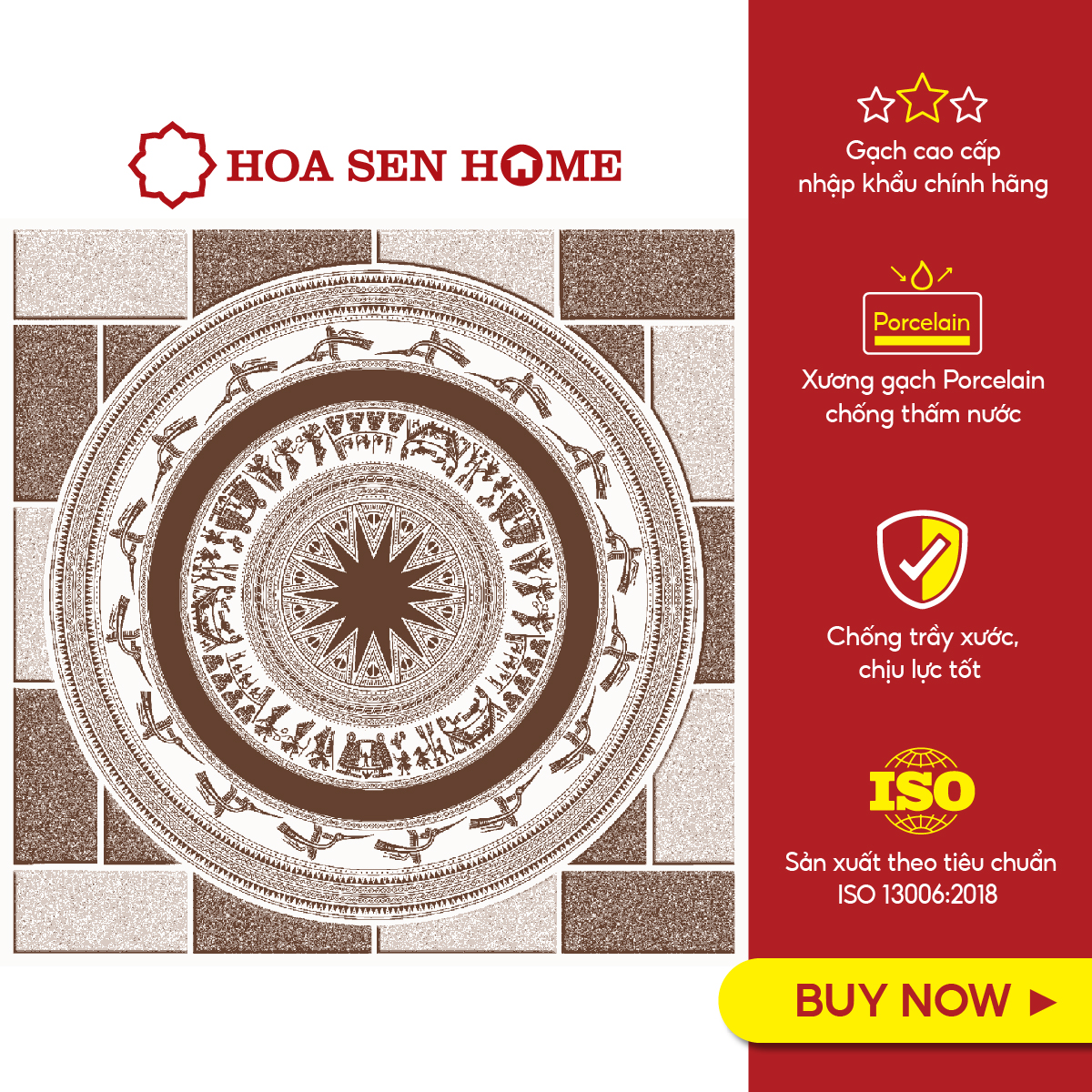- Gạch sân vườn có họa tiết trống đồng cùng với các hình ảnh viên gạch song song và so le màu nâu tạo nên một thiết kế mang nét văn hóa truyền thống có thể hài hòa với cả kiến trúc cổ điển và hiện đại. Những họa tiết và màu sắc này phù hợp với nhiều phong cách thiết kế, kiểu dáng hiện đại, xu hướng 2024 giúp người thiết kế nội thất có thể linh hoạt lựa chọn hơn cho sân vườn, hành lang, ban công của mình. THÔNG SỐ KỸ THUẬT
