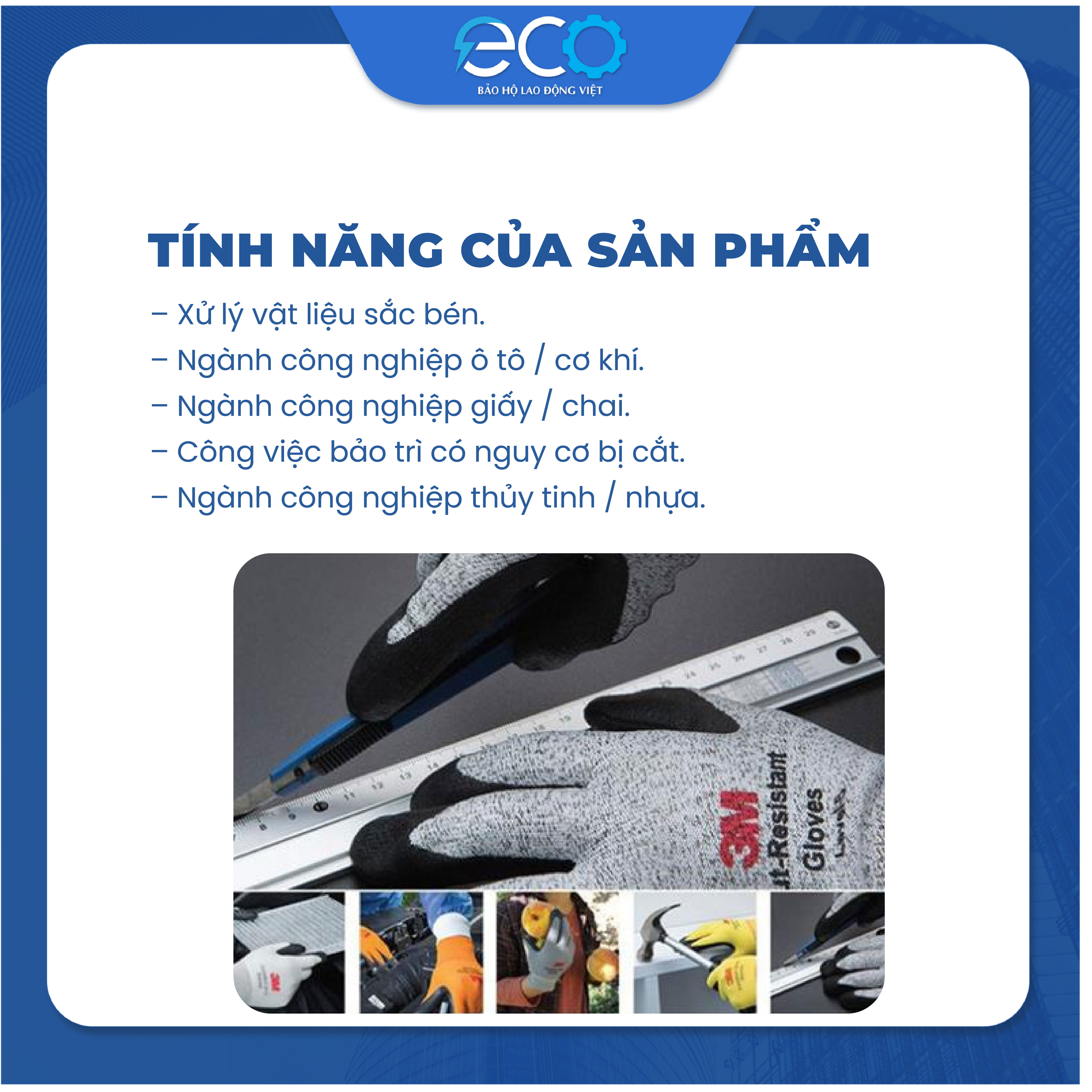 Ứng dụng: Sử dụng những nơi làm việc có nguy cơ bị cắt cao như: - Xử lý vật liệu sắc bén - Ngành công nghiệp ô tô / cơ khí - Ngành công nghiệp