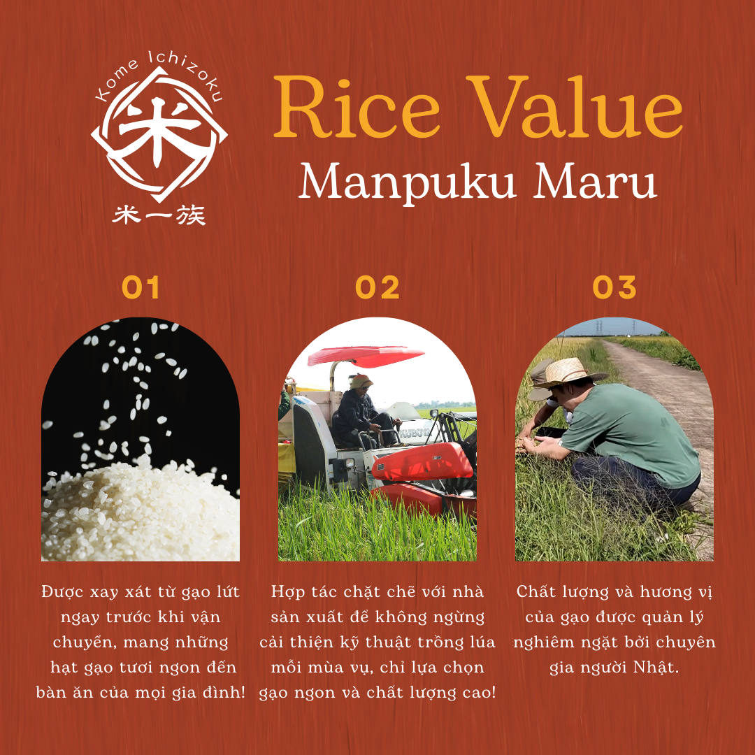 - Trải qua hơn 8 năm không ngừng nghiên cứu và phát triển giống lúa thuần chủng, tạo ra sản phẩm gạo giống Nhật Manpuku Maru phù hợp với khí hậu, thổ nhưỡng Việt Nam, có sức đề kháng cao, hương vị dẻo, thơm ngon.