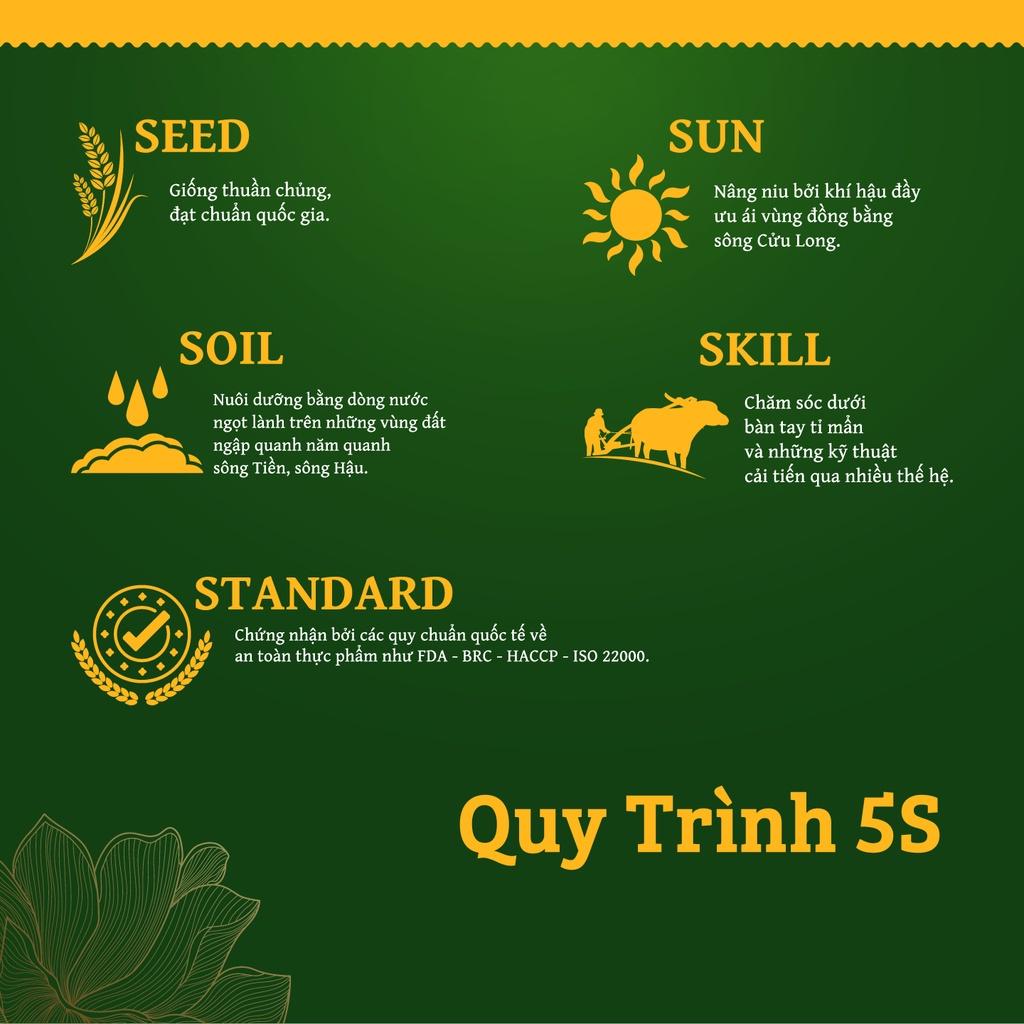 Nàng Sen Tài Lộc đạt chuẩn 3 Ngon. Gạo mới date xa, không pha trộn. Hạt cơm vừa ăn, dẻo thơm thuần khiết như hạt ngọc Tài Lộc từ đất trời ban tặng. Mang may mắn non nước Việt đến từng bữa cơm