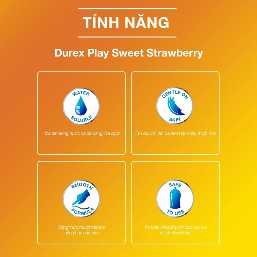 - Durex Play không phải để ngừa thai và không chứa chất diệt tinh trùng. Durex Play không mùi, không gây nhờn, tan trong nước và lượng chất bôi trơn thừa rất dễ rửa sạch bằng nước. Hướng dẫn sử dụng