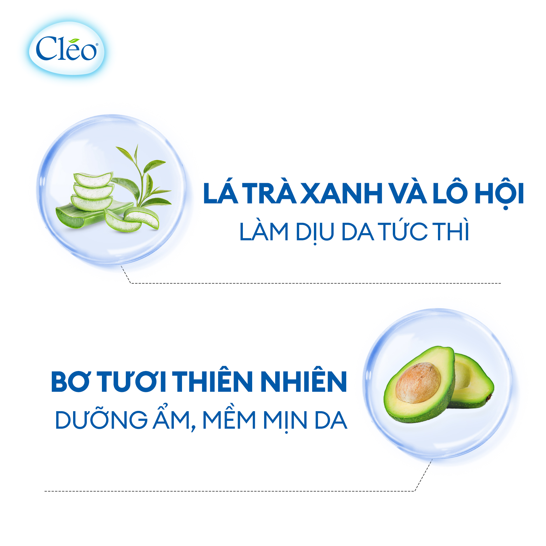 - Chiết xuất từ lá trà xanh thiên nhiên giúp làm DỊU DA và hương thơm dễ chịu