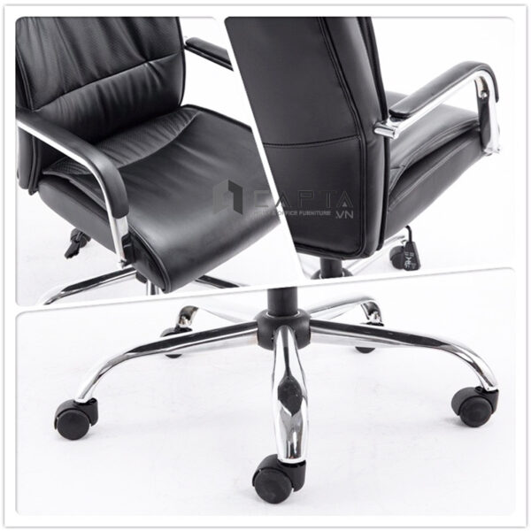 - Chất liệu: nệm PVC dày, tay thép mạ ốp PVC, chân xoay thép mạ chrome