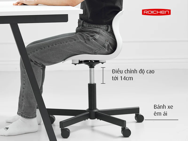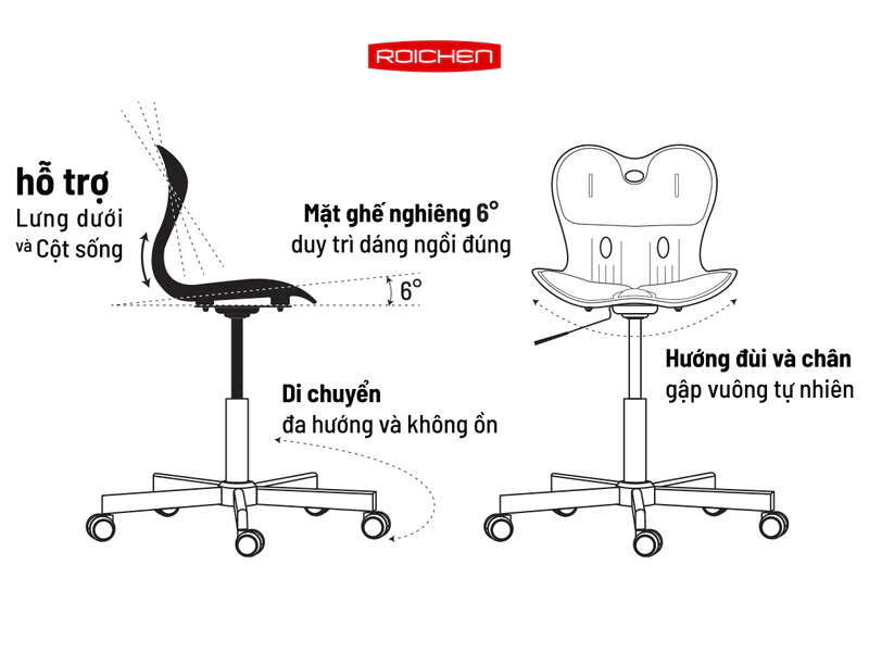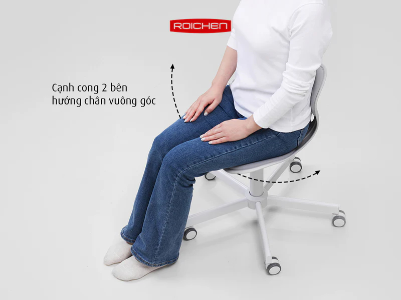 Ghế chỉnh dáng ngồi đúng có chân xoay từ thương hiệu Roichen Hàn Quốc được thiết kế giúp cho người dùng duy trì tư thế ngồi đúng một cách thoải mái, vững chãi, đưa cột sống quay trở về đường cong sinh lý. Điều này giúp ngăn ngừa các bệnh văn phòng do ngồi nhiều như đau lưng, cổ, vai, gáy...Hoặc thiếu tập trung khi học tập và làm việc do tư thế ngồi chưa đúng.