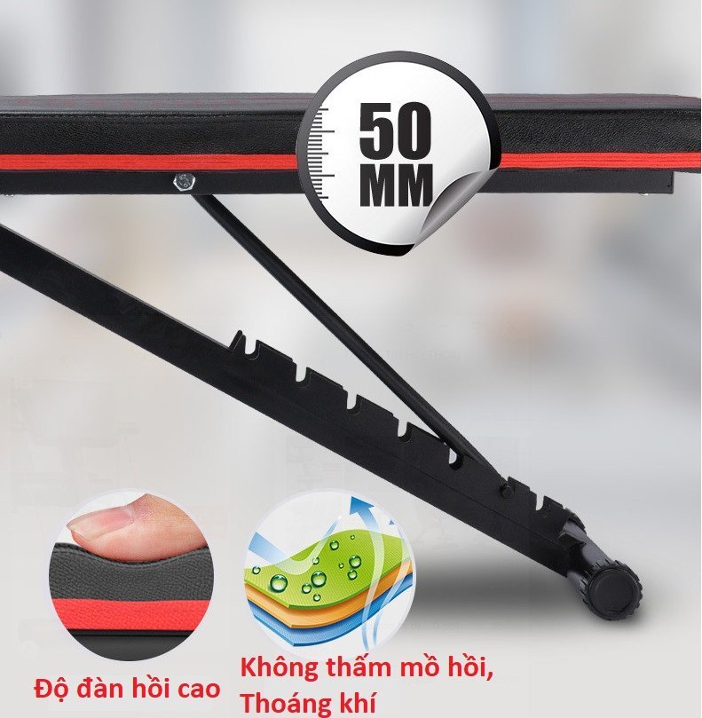- Mặt ghế tạ có thể điều chỉnh độ dốc nhiều mức. Bọc đệm mút dày êm ái, bên ngoài là lớp vải da có khả năng chống thấm, không gây mùi.