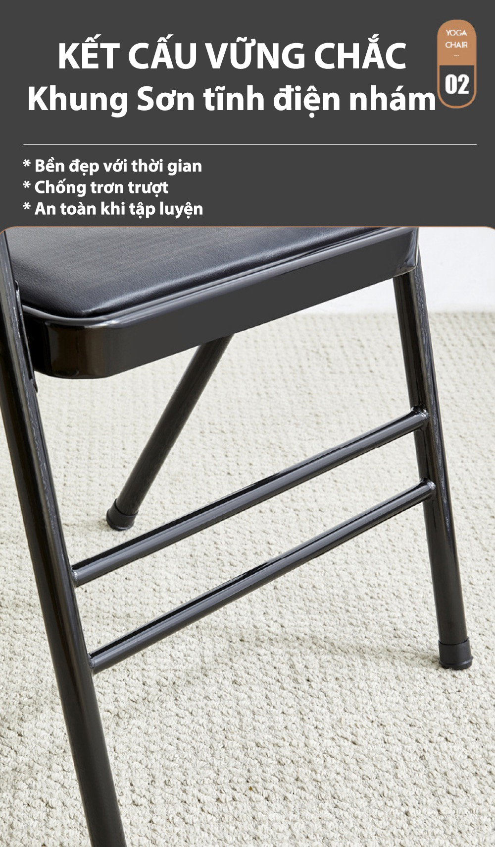 - Ngoài ra, khung sắt của toàn bộ ghế tập yoga này được sơn lớp tĩnh điện có bề mặt nhám mờ phủ bên ngoài - làm cho chiếc ghế vừa bền bỉ, chống gỉ sét tốt và sang trọng hơn.