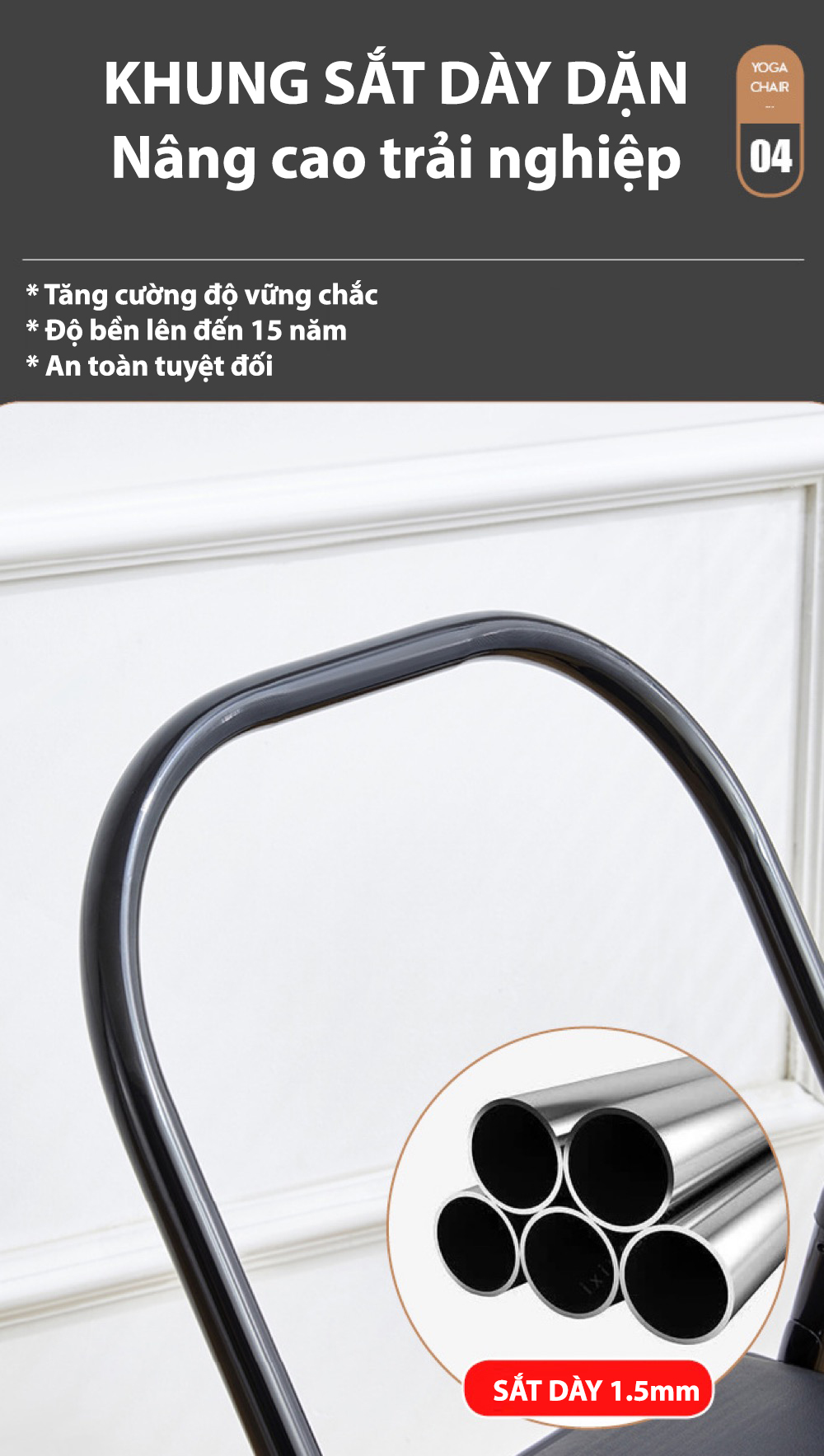 - Khung ghế Yoga Chair Basic NA được làm từ chất liệu sắt dày (khoảng 1.5ly) đảm bảo sự an toàn tuyệt đối và vững chãi hơn cho các tư thế tập luyện. Nó có thể chịu được tải trọng cơ thể lớn hoặc các tác động của lực khi di chuyển tư thế này sang tư thế khác.