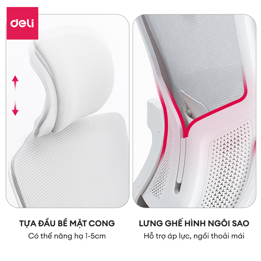Đặc điểm nổi bật Thiết kế công thái học: hỗ trợ cột sống, giảm đau mỏi lưng – cổ khi ngồi lâu. Lưng lưới thoáng khí: ngồi thoải mái, không nóng lưng. Đệm mút bọc