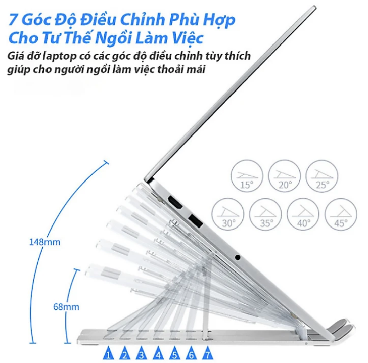 Giúp bạn sử dụng máy đúng tư thế ngồi tốt cho sức khỏe Còn hỗ trợ máy laptop được tản nhiệt tốt hơn Thiết kế có thể xếp gọn lại dễ dàng theo theo Có nhiều gốc độ cao điều chỉnh phù hợp mọi tư thế ngồi Sử dụng cho tất cả các dòng máy từ 11~17 inch Chất liệu bằng hợp kim nhôm cao cấp Nhiều lớp nhựa silicon chống trày máy và cố định giá đỡ Chịu được tải trọng lớn đến 20kg