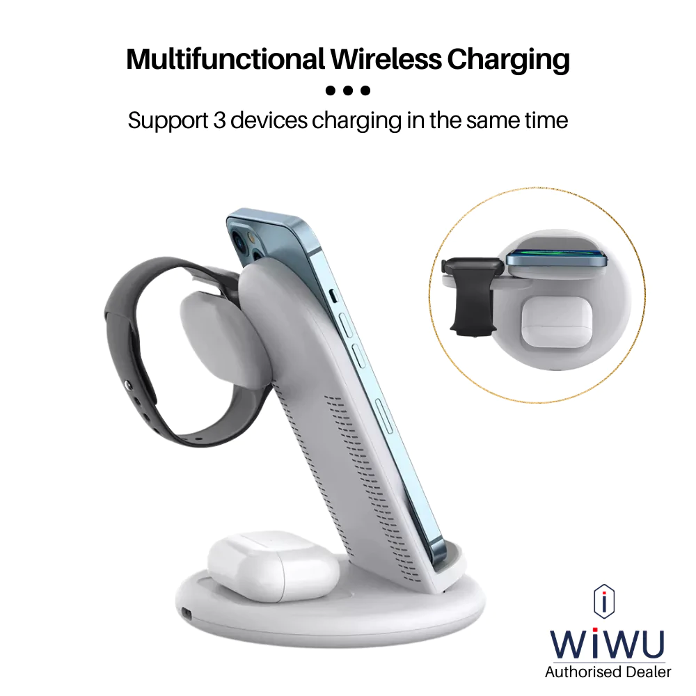 Giá đỡ từ tính kiêm Đế sạc không dây Qi sạc nhanh 15W 3 in 1 hỗ trợ sạc dành cho Apple Airpods / Appe Watch / iPhone hiệu WIWU Power Air Wireless Station (Smartchip, tháo rời và gấp gọn khi không sử dụng)           DÀNH CHO CÁC FAN NHÀ TÁO Bạn đang sở hữu nhiều sản phẩm của Apple. Bạn có quá nhiều dây sạc cho từng loại sản phẩm khác nhau như iPhone, Apple Watch, Airpod và bạn luôn gặp phiền phức với chỗ dây sạc rối rắm trên bàn. Đừng lo, hãy để chúng tôi giới thiệu đến bạn sản phẩm đến từ nhà WIWU đó là Đế sạc nhanh không dây 15W 3 in 1 hiệu WIWU Power Air Wireless Station Đây sẽ là sản phẩm hữu ích giúp bạn giải quyết được phiền não về dây, cáp sạc từ trước đến nay. Đế sạc nhanh không dây 15W 3 in 1 hiệu WIWU Power Air Wireless Station có kiểu dáng thiết kế mới lạ và nhiều chức năng khác chờ bạn khám phá.       SẠC NHANH THÔNG MINH, CÔNG SUẤT ĐA DẠNG Đế sạc nhanh không dây 15W 3 in 1 hiệu WIWU Power Air Wireless Station sạc tất cả trong một, sạc nhanh không dây 15W, 3 chíp thông minh giúp việc sạc thiết bị của chúng ta thuận tiện hơn. Thiết bị có công suất sạc cho từng loại sản phẩm như sau: