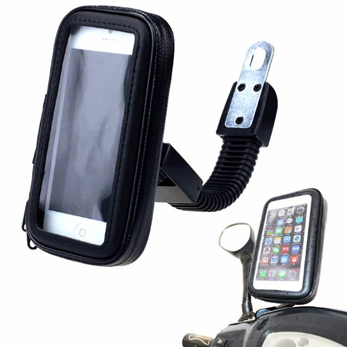 • Giá đỡ điện thoại trên xe máy là phụ kiện giá đỡ gắn vào chân kính chiếu hậu (lỗ 8mm) cho hầu hết chủng loại mô tô, xe máy hiện nay trên thị trường Việt Nam.