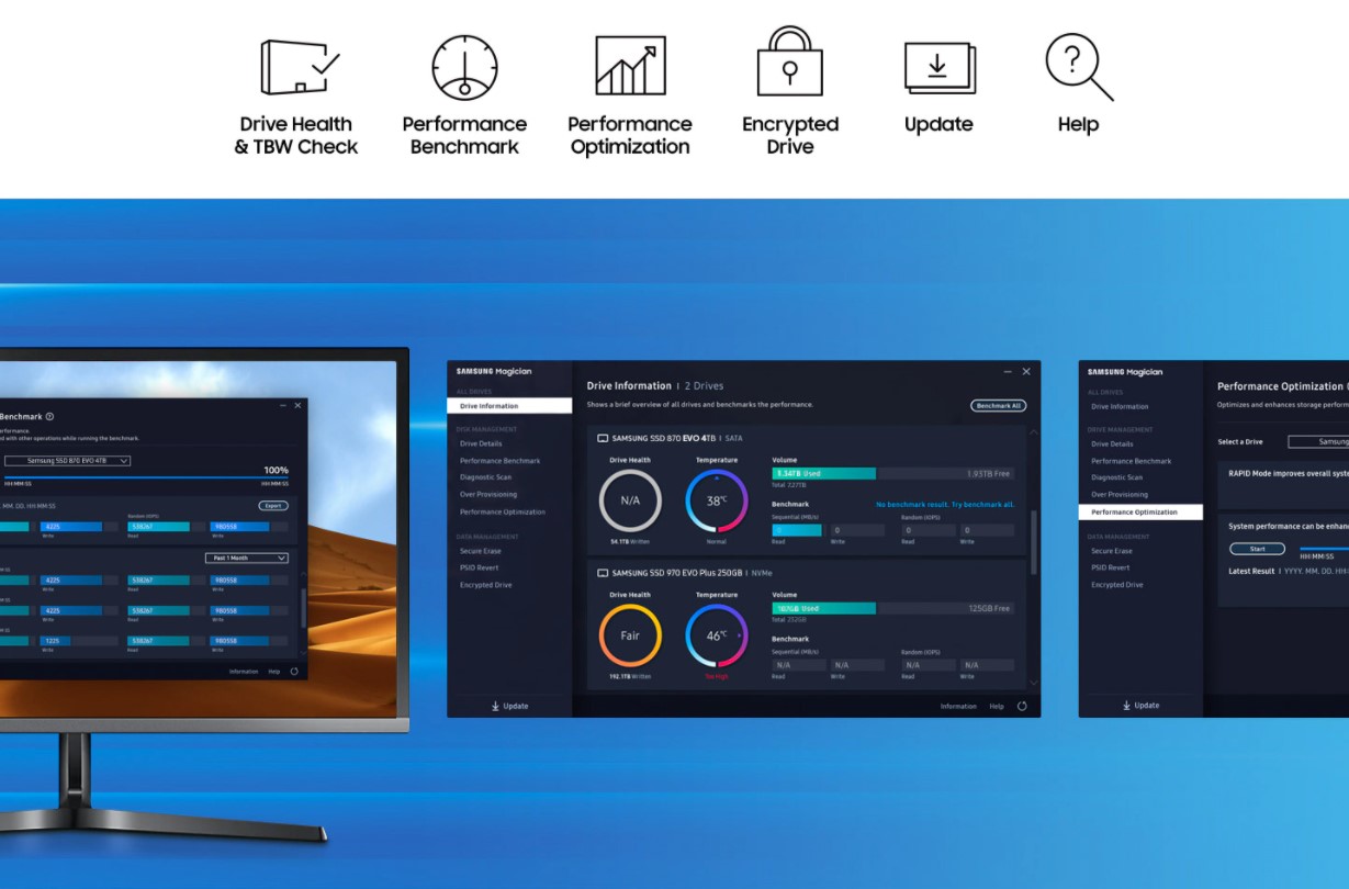 Phần mềm Samsung Magician phiên bản mới và được cải tiến sẽ giúp SSD của bạn luôn được kiểm soát. Giúp bạn dễ dàng quản lý ổ đĩa của mình bằng một loạt các công cụ hữu ích, theo dõi tình trạng và sức khỏe của ổ đĩa hoặc thậm chí nâng cao hiệu suất của nó.