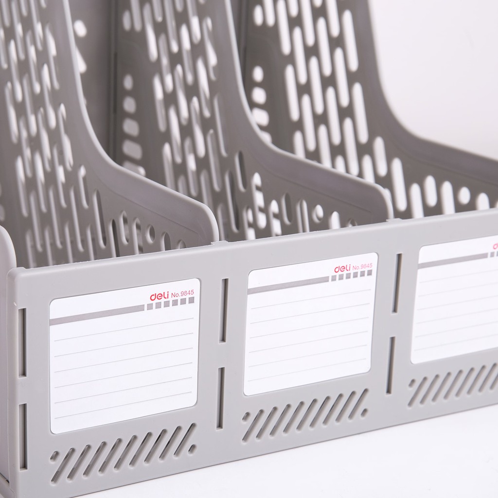 TÍNH NĂNG SẢN PHẨM ️Chất liệu nhựa PP chắc chắn, siêu bền, đảm bảo lưu trữ tài liệu ️Dễ dàng sử dụng, lưu trữ tài liệu ️Thiết kế mở, tránh bụi, nhiều lỗ nhỏ giúp đứng vững hơn ️Nhãn dán trên từng ngăn giúp dễ dàng phân loại giấy tờ, tài liệu hơn THÔNG TIN SẢN PHẨM: Tên sản phẩm: Giá tài liệu 3 ngăn đứng Deli Mã sản phẩm: E9845 Màu sắc: Ghi xám.