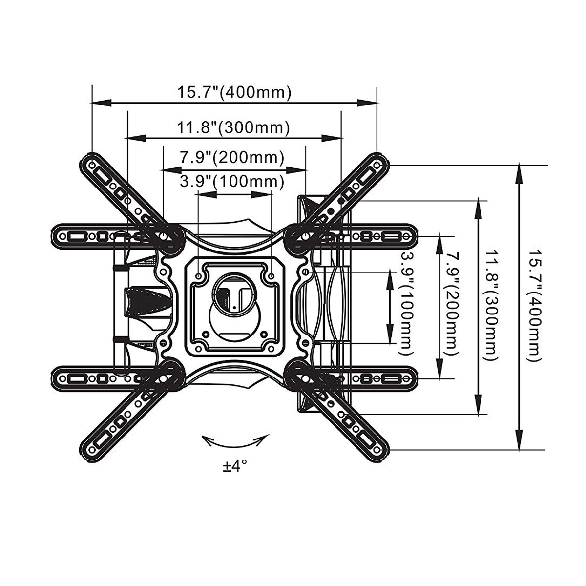 Thông số kĩ thuật - Vesa: 400x400 mm - Xoay 180 độ tại các khớp nối - Thiết kế kẹp nhựa đế nẹp dây điện - Khoảng cách kéo dãn tối đa: 468mm - Thu