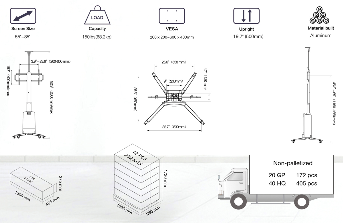 Được thiết kế rất tinh tế, tiện dụng và cơ động để có thể gắn tivi có trọng lượng tổng lên đến 68,2 kg, lắp được màn hình phẳng tử 55 inch đến 85 inch, với 4 bánh xe có chốt phanh đã được lắp đặt sẵn, nâng hạ không dây bằng Remote điện tử.