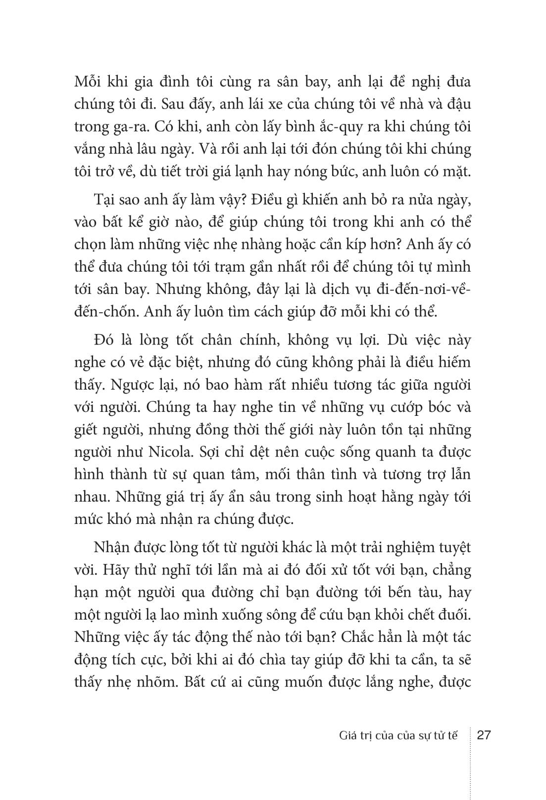 Việc cố gắng tạo ra điều gì đó tích cực trong cuộc sống là điều vô cùng quan trọng. Chúng ta không được sinh ra để gây rắc rối và làm hại người khác. Như Piero Ferrucci đã trình bày một cách đầy đủ và mạch lạc trong cuốn sách Giá trị của sự tử tế này, để cuộc sống thật sự có giá trị, ta cần củng cố và nuôi dưỡng những giá trị cơ bản của con người như sự nhiệt thành, lòng tốt và sự đồng cảm. Nếu làm được điều đó, cuộc sống của chúng ta sẽ trở nên có ý nghĩa, hạnh phúc và bình an hơn, đồng thời sẽ góp một phần tích cực vào thế giới quanh m.ình.