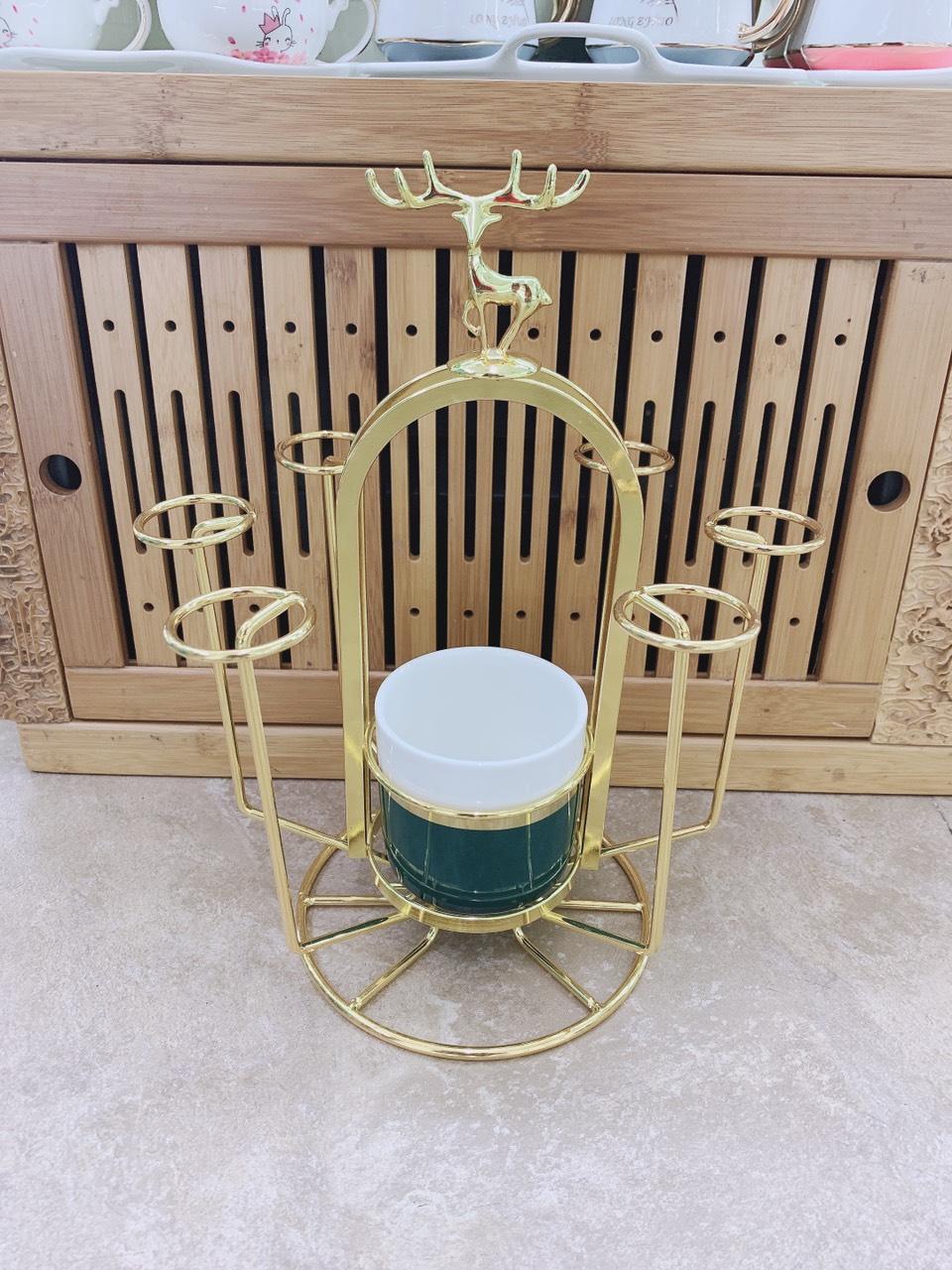 Khay úp cốc 6 chiếc hình gấu mạ vàng, có ống sứ cắm thìa dĩa Giá úp ly, úp cốc mạ vàng kèm ly sứ men xanh đựng dĩa thìa Giá úp có 6 cột