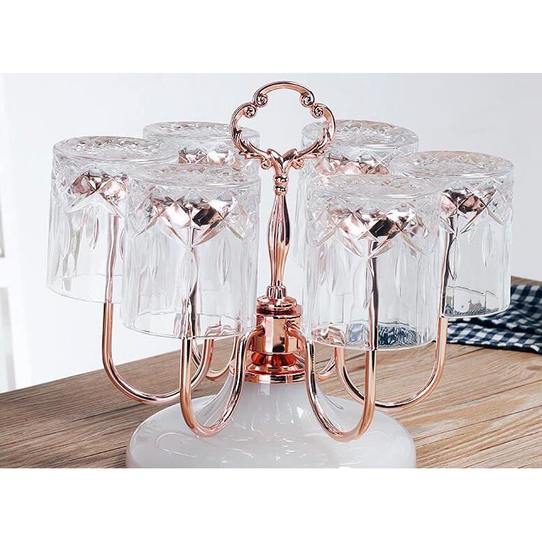 Giá úp cốc 6 chiếc trụ inox màu vàng hồng đế đá Giá cắm 6 chiếc cốc dạng gọn Giá có khay hứng nước Chất liệu sắt sơn tĩnh điện cao cấp màu vàng cực