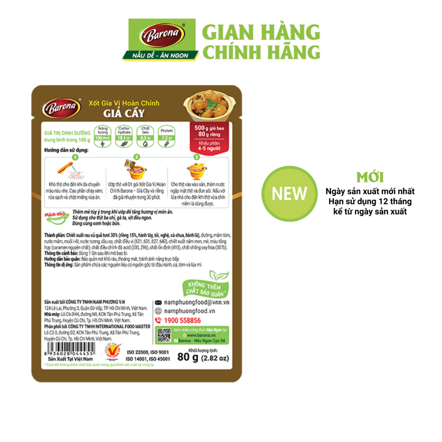 XỐT GIA VỊ HOÀN CHỈNH BARONA BÒ KHO 80G Xốt Gia Vị Hoàn Chỉnh Barona là công thức phối trộn độc đáo giữa CHIẾT XUẤT RAU CỦ QUẢ TƯƠI như hành, tỏi, me, cà chua…cùng