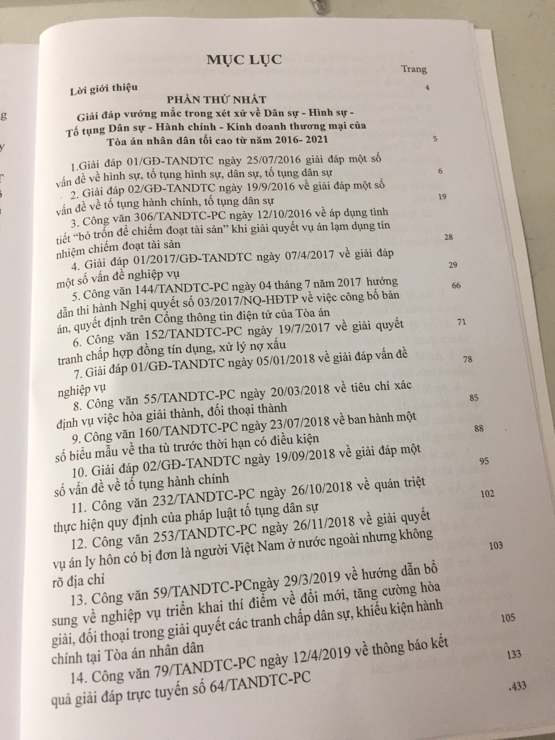 Phần thứ nhất: Giải đáp vướng mắc trong xét xử về Dân sự, Hình sự, Tố tụng dân sự, Hành chính, Kinh doanh thương mại của Tòa án nhân dân tối cao từ năm 2016 - 2021.