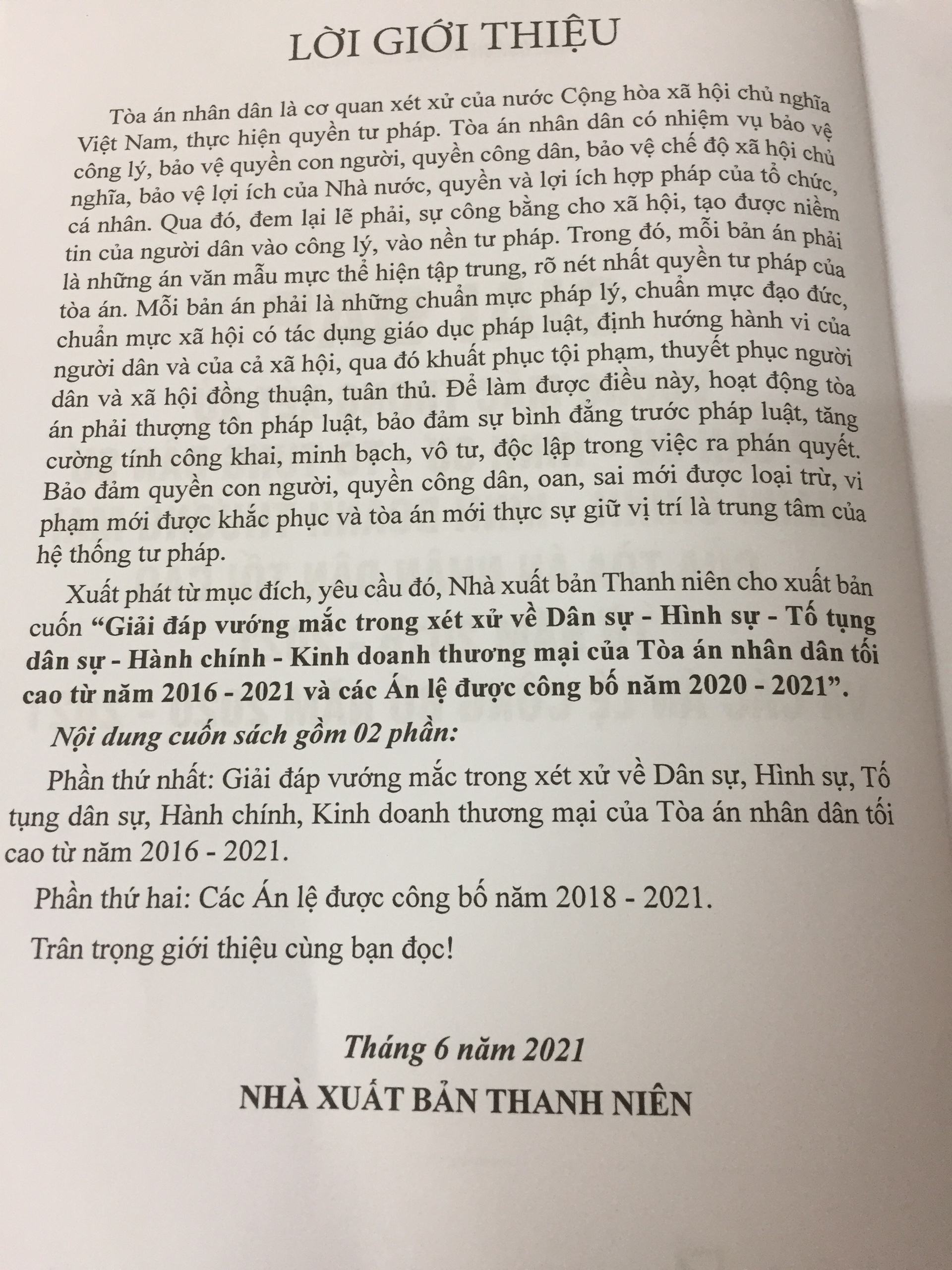 Xuất phát từ mục đích, yêu cầu đó, Nhà xuất bản Thanh niên cho xuất bản cuốn “Giải đáp vướng mắc trong xét xử về Dân sự, Hình sự, Tố tụng dân sự Hành chính, Kinh doanh thương mại của Tòa án nhân dân tối cao từ năm 2016 - 2021 và các Án lệ được công bố năm 2020 - 2021”.