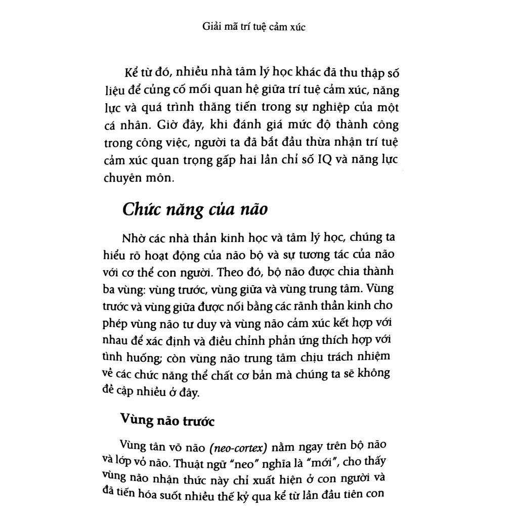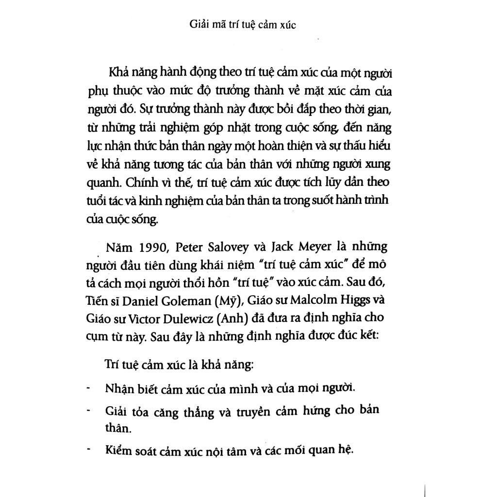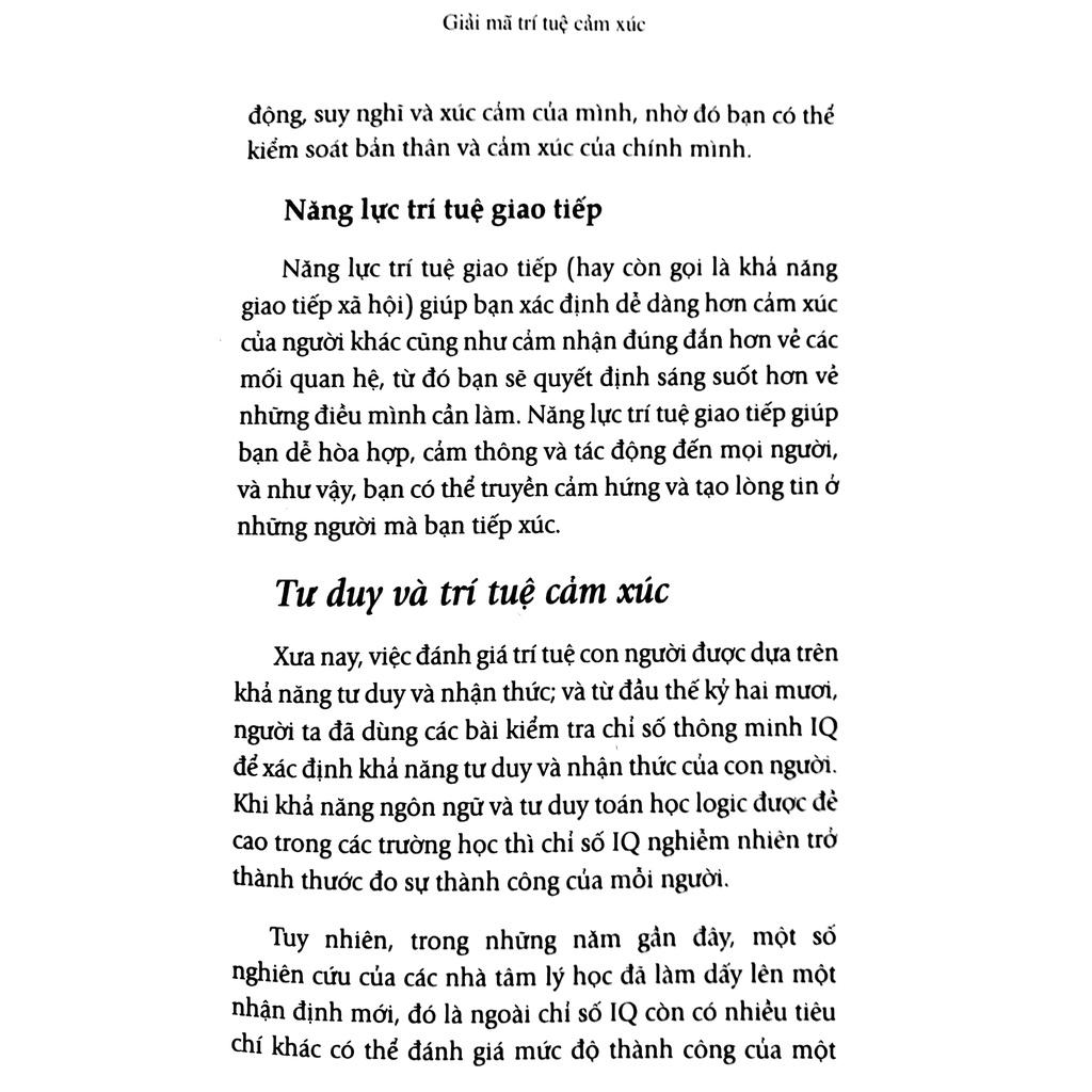 “Giải mã trí tuệ cảm xúc” giúp bạn hiểu được khởi nguồn của cảm xúc, cách chúng tác động đến bạn và quan trọng hơn là cách tận dụng sức mạnh của cảm xúc để đạt được thành công. Trong môi trường kinh doanh nhiều biến động như hiện nay, bạn cần phải linh hoạt, điềm tĩnh, thích nghi tốt và có khả năng làm chủ bản thân. Khi gặp trở ngại, bạn cần có khả năng dẫn đầu và truyền cảm hứng cho đồng đội, giúp họ giữ vững ý chí và quyết tâm để đạt được mục tiêu chung. Và khi các mối quan hệ với đồng nghiệp, khách hàng, bạn bè, người thân, vợ/chồng… có nguy cơ rạn nứt, bạn cần cố gắng tìm cách hòa hợp với mọi người. Chính năng lực trí tuệ cảm xúc sẽ giúp bạn thực hiện tất cả những điều này.