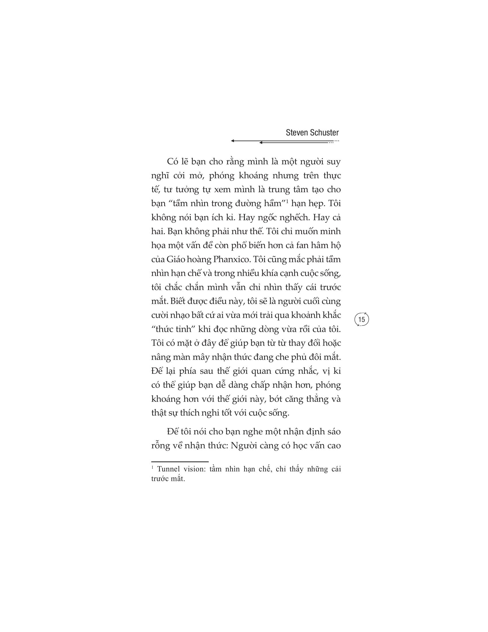 “Bản chất con người vốn hay suy nghĩ. Chính khả năng suy nghĩ đó khiến chúng ta khác biệt với các giống loài khác. Chúng ta nhận thức được việc mình suy nghĩ. Thói quen nhận thức ngày càng phát triển hơn khi chúng ta lớn lên. Chúng ta học hỏi từ cha mẹ. Sau đó đi học, lên đại học, tìm được công ăn việc làm, đọc thật nhiều sách, xem cả tá phim ảnh và kết nối với mọi người. Mỗi một hoạt động này đều vô tình ảnh hưởng đến cách suy nghĩ của chúng ta. Kinh nghiệm nhận thức định hình thế giới quan của mỗi người. Mọi thứ mà cá nhân chúng ta trải nghiệm sẽ đi qua bộ lọc của bản thân và được hợp thức hóa. Rất thực tế. Còn thực tế hơn cả những thứ chúng ta chưa từng trải qua. Cho dù những điều chúng ta tin có thể không phải lúc nào cũng đúng.”