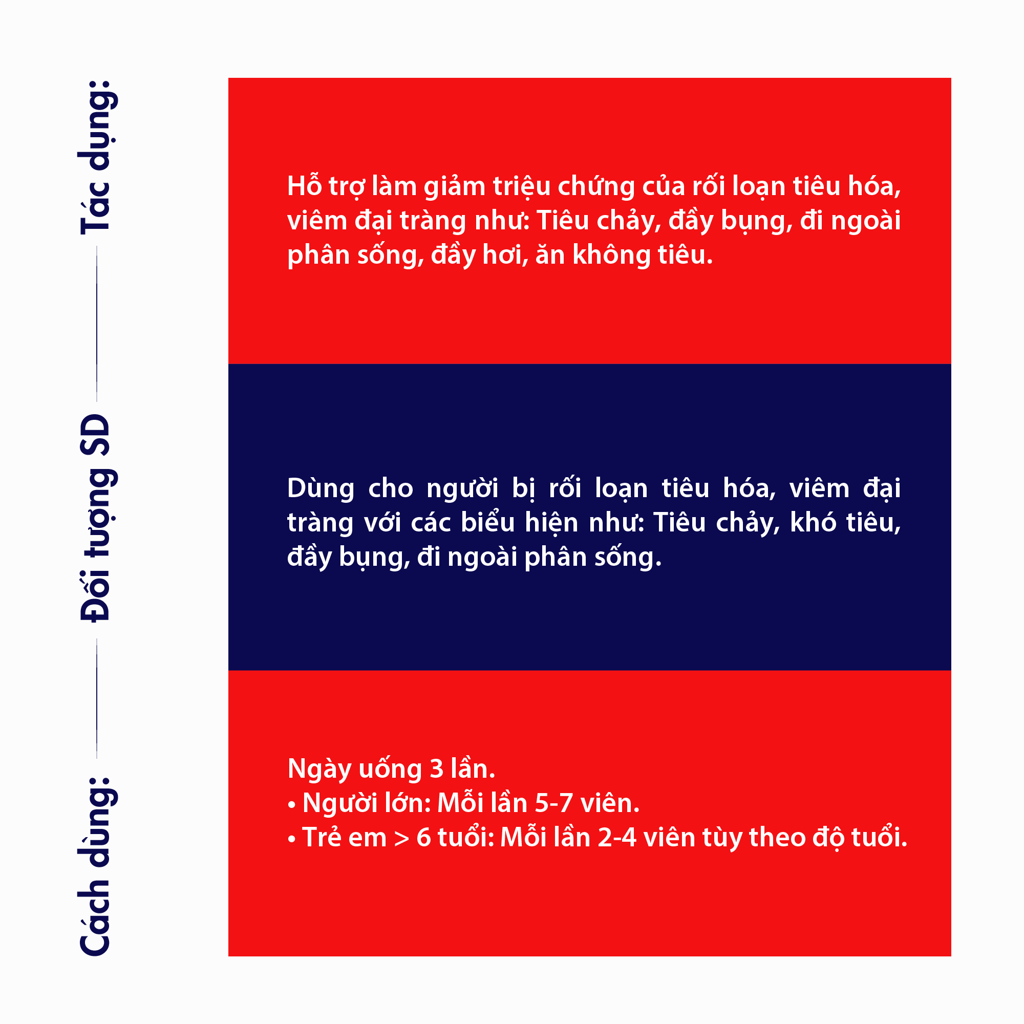 - Hỗ trợ làm giảm các triệu chứng rối loạn tiêu hóa, tiêu chảy, đi ngoài nhiều lần.