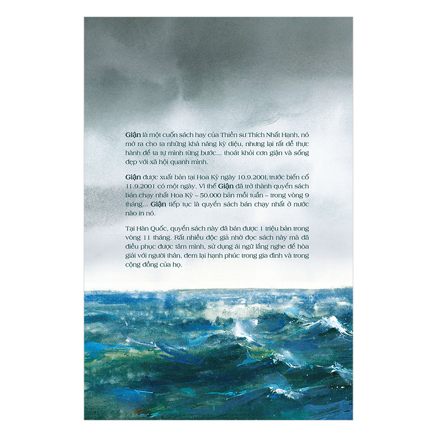 Giận (Tái Bản 2019) Giận là một cuốn sách hay của Thiền sư Thích Nhất Hạnh, nó mở ra cho ta những khả năng kỳ diệu, nhưng lại rất dễ thực hành để ta tự mình từng bướ thoát khỏi cơn giận và sống đẹp với xã hội quanh mình. Giận được xuất bản tại Hoa Kỳ ngày 10.9.2001, trước biến cố 11.9.2001 có một ngày. Vì thế Giận đã trở thành quyển sách bán chạy nhất Hoa Kỳ - 50.000 bản mỗi tuần - trong vòng 9 thá Tại Hàn Quốc, quyển sách này đã bán được 1 triệu bản trong vòng 11 tháng. Rất nhiều độc giả nhờ đọc sách này mà đã điều phục được tâm mình, sử dụng ái ngữ lắng nghe để hoà giải với người thân, đem lại hạnh phúc trong gia đình và trong cộng đồng của họ.