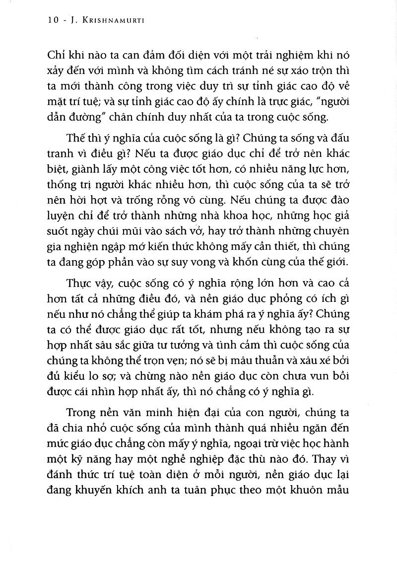 Càng đi sâu vào tác phẩm, càng nhận ra, Giáo Dục Và Ý Nghĩa Cuộc Sống mang đến câu chuyện hoàn toàn mới về giáo dục. Theo đó, con người là một tổng thể hài hòa được tạo thành từ nhiều khía cạnh khác nhau. Nền giáo dục phải mang đến sự hợp nhất các khía cạnh riêng biệt này – vì nếu không có sự hợp nhất ấy, cuộc sống sẽ trở thành một chuỗi những cuộc xung đột và nỗi bất hạnh. Muốn tạo dựng một nền giáo dục đúng đắn, ta phải hiểu rõ ý nghĩa cuộc sống trong tính toàn thể của nó.
