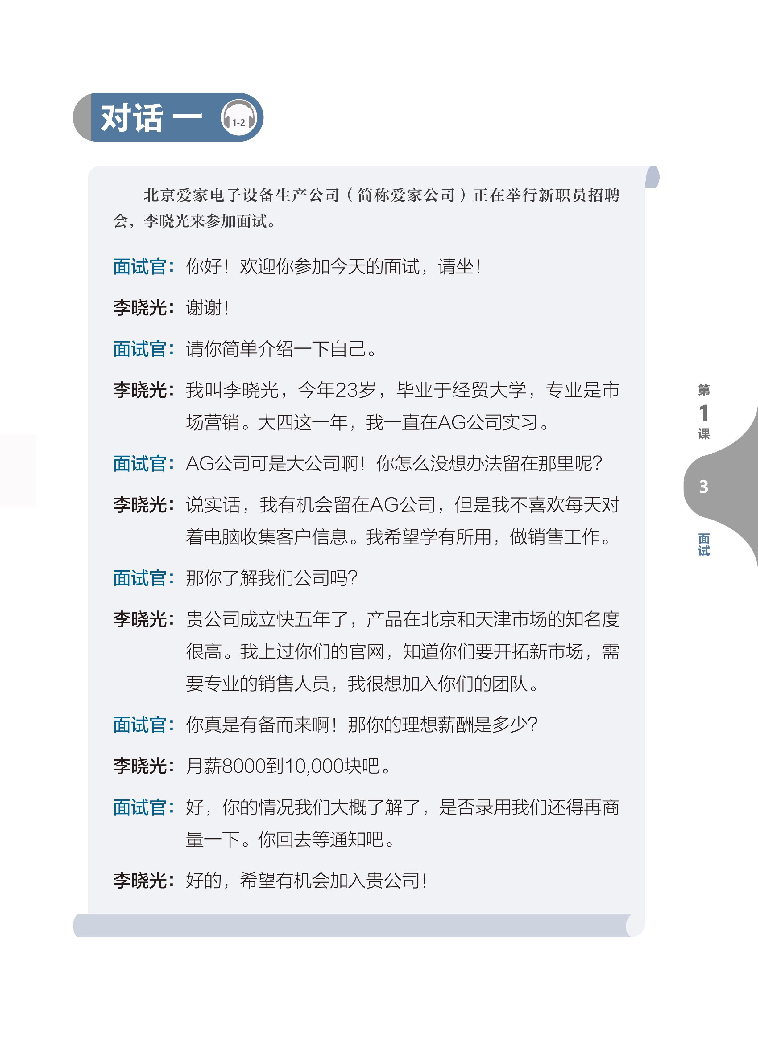 • Từ ngữ và Hội thoại: Nội dung cốt lõi của mỗi bài. Mỗi bài học hai đoạn hội thoại liên quan đến chủ đề bài học, thúc đẩy tình tiết câu chuyện phát triển, đồng thời nắm vững các từ ngữ trọng điểm liên quan, đặc biệt là các từ ngữ thường dùng trong môi trường kinh doanh.