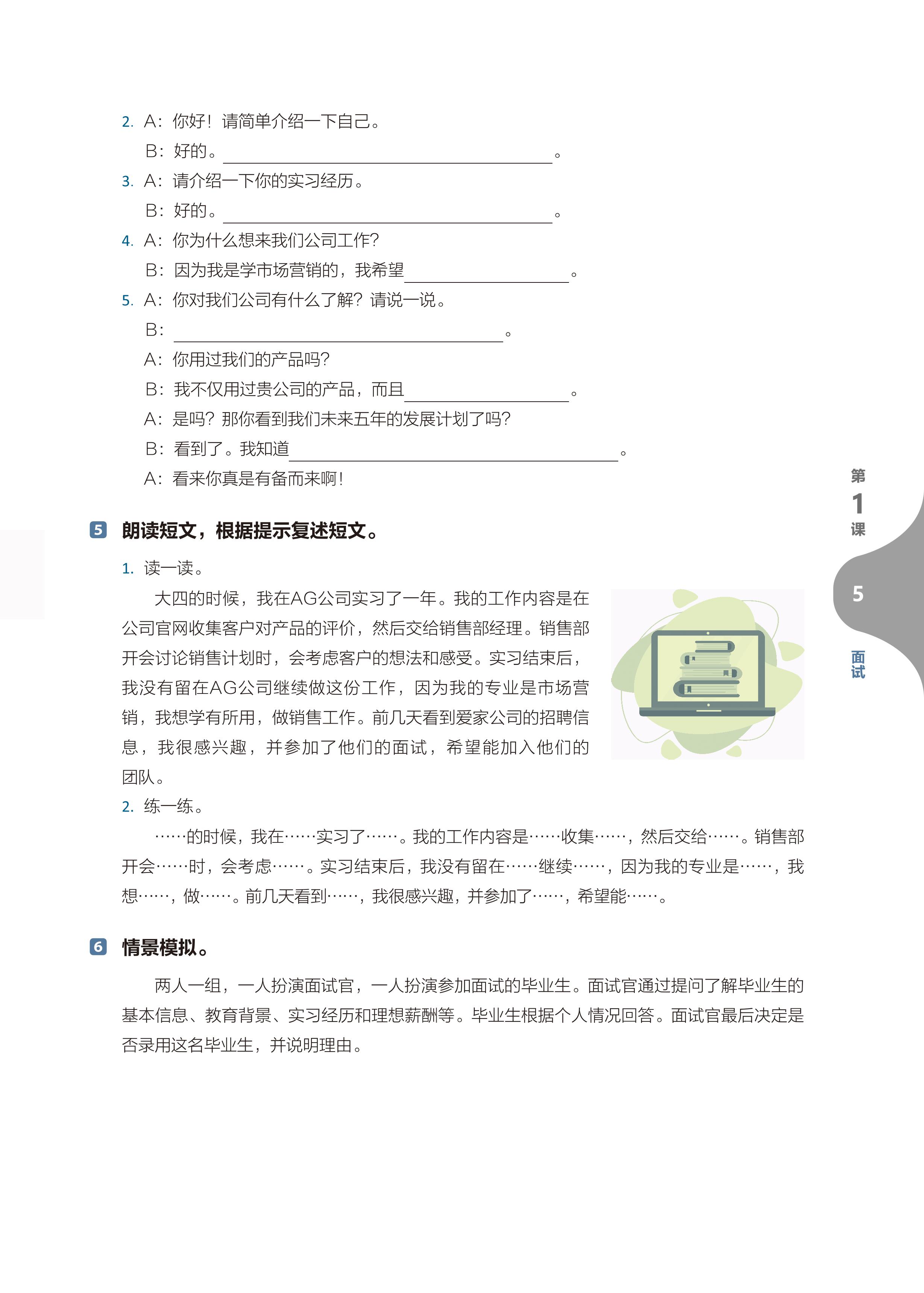 Cuốn giáo trình này lấy trải nghiệm đầu đời tại nơi làm việc của một sinh viên mới tốt nghiệp làm tiến trình câu chuyện, các chủ đề thảo luận bao gồm phỏng vấn, nhận việc, cũng như điều tra, họp hành, mời khách hàng, hội đàm với khách hàng, tham quan nhà máy, chiêu đãi khách hàng, thiết kế phương án khuyến mãi, đi công tác, tham gia triển lãm,... trong quá trình làm việc, thể hiện toàn bộ quá trình một nhân viên mới lần đầu tham gia hợp tác thương mại. Cuối cùng, nội dung công việc của nhân vật phát triển từ bán hàng trong nước sang xuất khẩu quốc tế, được nối tiếp bằng cuốn “Giáo trình tiếng Trung giao tiếp thương mại: Tiếng Trung thực chiến trong kinh doanh quốc tế”, đặt nền móng cho việc học tập. Các vai trò tại nơi làm việc như tổng giám đốc công ty, trưởng phòng, nhân viên bình thường và khách hàng trong giáo trình được định vị rõ ràng và có cá tính riêng biệt.