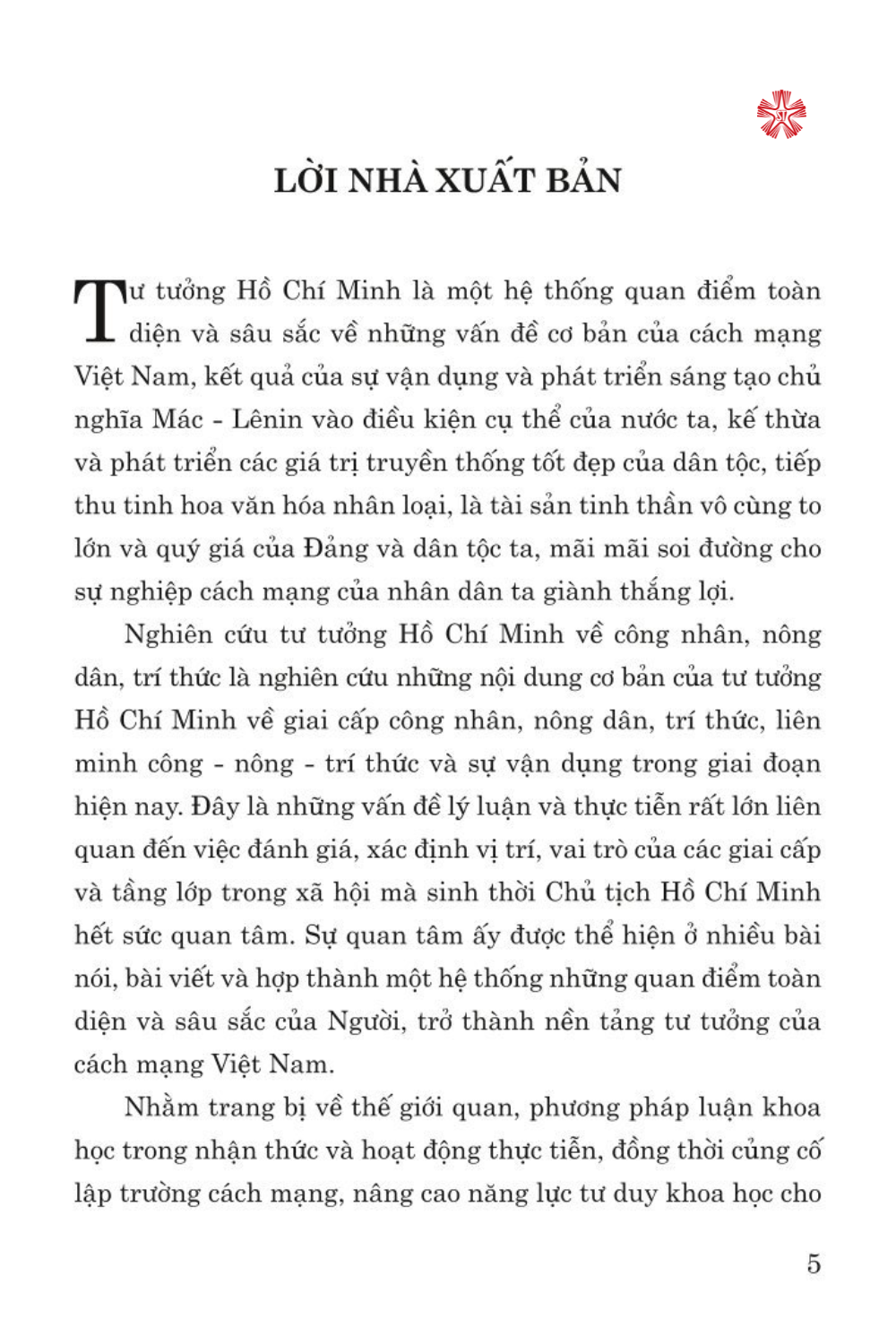 Giáo trình tư tưởng Hồ Chí Minh về công nhân, nông dân, trí thức . Giá bìa: 107.000 Nội dung bao gồm: 1.Chương 1 - Nhập môn tư tưởng Hồ Chí Minh về công nhân, nông dân, trí thức 2. Chương 2: - Tư tưởng Hồ Chí minh về giai cấp công nhân 3. Chương 3:- Tư tưởng Hồ Chí Minh về giai cấp nông dân 4. Chương 4 - Tư tưởng Hồ Chí Minh về trí thức 5. Chương 5 - Tư tưởng Hồ Chí Minh về liên minh công nhân, nông dân và trí thức.