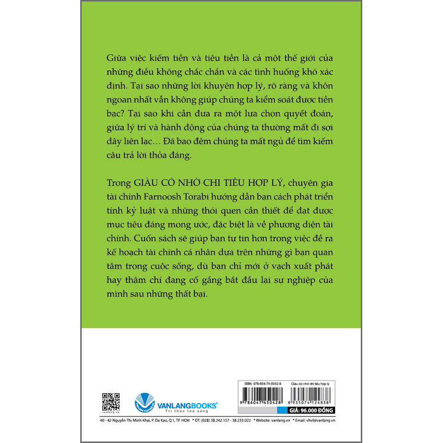 Trong " Giàu có nhờ chi tiêu hợp lý " , chuyên gia tài chính Farnoosh Torabi hướng dẫn bạn cách phát triển tính kỷ luật và những thói quen cần thiết để đạt được mục tiêu đáng mong ước, đặc biệt là về phương diện tài chính. Cuốn sách sẽ giúp bạn tự tin hơn trong việc đề ra kế hoạch tài chính cá nhân dựa trên những gì bạn quan tâm trong cuộc sống, dù bạn chỉ mới ở vạch xuất phát hay thậm chí đang cố gắng bắt đầu lại sự nghiệp của mình sau những thất bại.