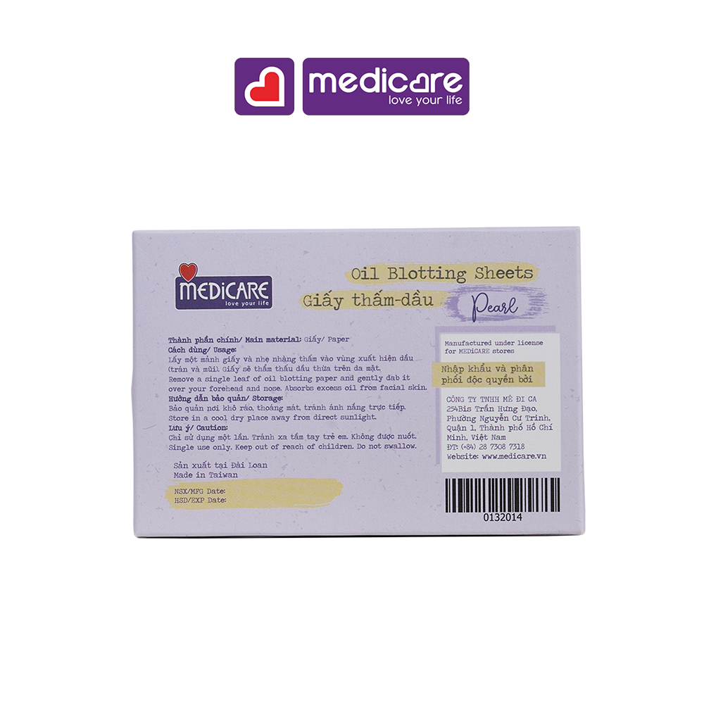 Giấy Thấm Dầu MEDiCARE 100 tờ   THÔNG TIN SẢN PHẨM: • Đơn vị tính và Quy cách đóng gói: Một Gói – 100 tờ. • Nước xuất xứ: sản xuất tại Đài Loan.   CÔNG DỤNG: • Giúp thẩm thấu dầu thừa trên da, giảm bóng nhờn. • Cho làn da thông thoáng, hạn chế phát sinh mụn.   HƯỚNG DẪN SỬ DỤNG: • Lấy một mảnh giấy và nhẹ nhàng thấm vào vùng xuất hiện dầu (trán và mũi). • Giấy sẽ thẩm thấu dầu thừa trên da mặt.   Hướng dẫn bảo quản: Bảo quản nơi khô ráo, nhiệt độ dưới 35°C, tránh tiếp xúc trực tiếp với ánh nắng mặt trời.   • Chỉ sử dụng bên ngoài. • Chúng tôi luôn cố gắng đảm bảo tất cả thông tin về công dụng và hướng dẫn sử dụng của sản phẩm luôn được cập nhật đầy đủ và chính xác trên trang web. • Đọc kỹ thông tin sản phẩm trên bao bì hoặc tờ rơi hướng dẫn đính kèm trước khi dùng và chỉ được sử dụng theo như hướng dẫn.