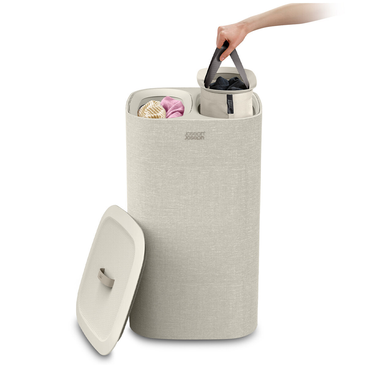 Hai ngăn 30 lít cho phép dễ dàng phân loại các loại vải như vải sáng, vải tối màu và vải màu. Túi tote có thể tháo rời và có tay cầm giúp việc mang