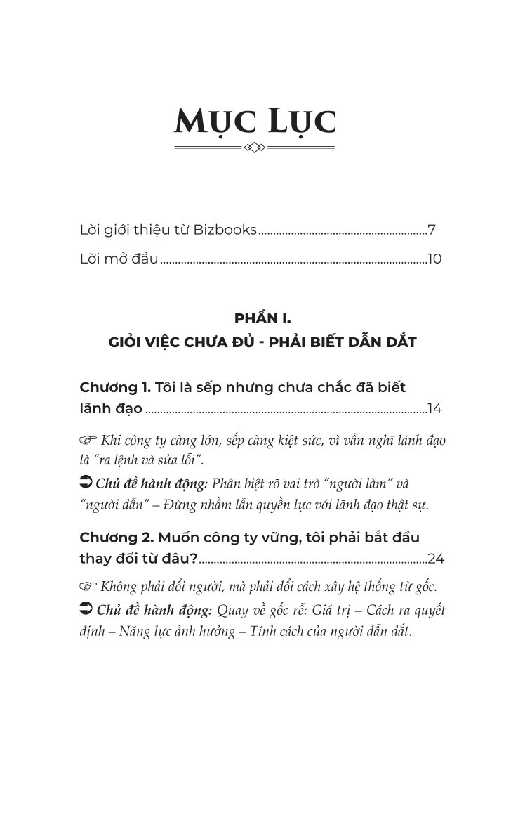 Thứ ba, cuốn sách cho bạn một bản đồ rõ ràng để thoát ra khỏi vai “người làm tất” – bằng hành động. Mỗi chương sách không khép lại bằng kết luận suông, mà bằng một “chủ đề hành động” cực kỳ thực tế. Ví dụ: “Xây kỷ luật từ chính mình”, “Phát triển người kế thừa”, “Đừng truyền cảm hứng bằng lời, hãy khiến nó 'chạm được – sống được'”... Những chủ đề hành động này không phải để ghi nhớ mà để thực thi – nghĩa là bạn có thể lấy chúng ra áp dụng ngay vào công việc ngày mai. Chúng giúp bạn định hình lại vai trò của mình: không còn là người làm tốt nhất, mà là người khiến cả đội ngũ trở nên xuất sắc hơn.