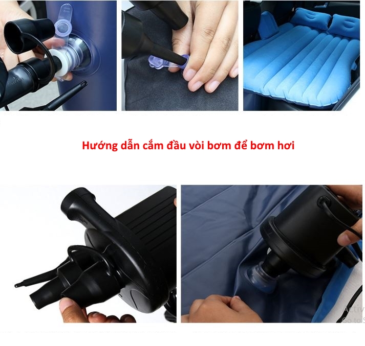 - Thiết kế 2 khoang bơm: 1 cho phần đệm, 1 cho phần chân, có thể chỉ bơm riêng phần đệm khi để trên nền đất hoặc thùng xe, tiện dụng mang theo, để ở cốp xe khi không sử dụng, có thể dùng trên ô tô, khi đi dã ngoại Hướng dẫn sử dụng : – Bước 1: Cắm bơm vào tẩu điện. – Bước 2: Đặt giường hơi lên hàng ghế sau,mở nắp van màu trắng ra – Bước 3: Dùng đầu bơm to nhất bơm hơi vào bên trong – Bước 4: Bơm đầy hơi rồi lắp cái van màu đen vào – Bước 5: Dùng đầu bơm cỡ trung bơm vào cho đầy hơi thì dừng lại – Bước 6: Rút đầu bơm và đóng nắp van lại – Bước 7: Trải thẳng mặt giường lên ghế – Bước 8: Lặp lại thao tác như bước 2 Một số hình ảnh của sản phẩm: