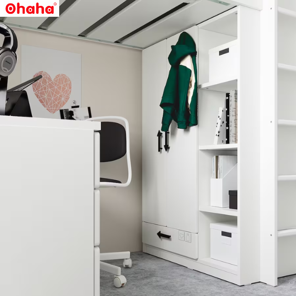 Sản phẩm chỉ bao gồm 1 giường tầng và 1 bàn học như hình, không kèm chăn ga gối nệm và đồ trang trí Giường tầng thông minh đa năng Ohaha - GTĐN007 được rất nhiều khách hàng yêu thích và lựa chọn bởi thiết kế thời thượng, tiện dụng và tiết kiệm diện tích.   Giường tầng thông minh tiện dụng và tối ưu Giường tầng thông minh đa năng Ohaha - GTĐN007 được thiết kế tiện dụng, tiết kiệm diện tích và chắc chắn, an toàn cho cả người lớn và trẻ nhỏ khi nằm. Đây là sự lựa chọn ưu việt cho không gian nội thất phòng ngủ nhỏ hẹp. Mẫu sản phẩm bao gồm cả bàn học, tủ quần áo và kệ sách.   >>Xem thêm: Mẫu giường tầng thông minh sở hữu thiết kế đa dạng độc đáo và đồng thời mang đến nhiều công năng hữu dụng. Chỉ trong một sản phẩm, bạn có thể tận dụng được nhiều món đồ nội thất mà lại không chiếm quá nhiều diện tích không gian.   Gỗ MDF lõi xanh - chất liệu an toàn, thân thiện với môi trường. Giường tầng thông minh đa năng Ohaha - GTĐN007 được làm từ chất liệu gỗ MDF lõi xanh nhập khẩu, bề mặt phủ Melamine 2 mặt chống ẩm tốt. Sản phẩm không chỉ đẹp hơn về mỹ quang mà còn mang lại độ bền chắc lâu dài. Đã qua xử lý chống cong vênh, mối mọt bằng công nghệ của Đức, Sản phẩm thân thiện và an toàn cho sức khỏe gia đình và môi trường. Phụ kiện nhập khẩu đảm bảo chất lượng uy tín. Giường tầng được thiết kế cam kết an toàn về kỹ thuật, có thể chịu được trọng lượng lớn nên gia đình có thể yên tâm khi sử dụng.