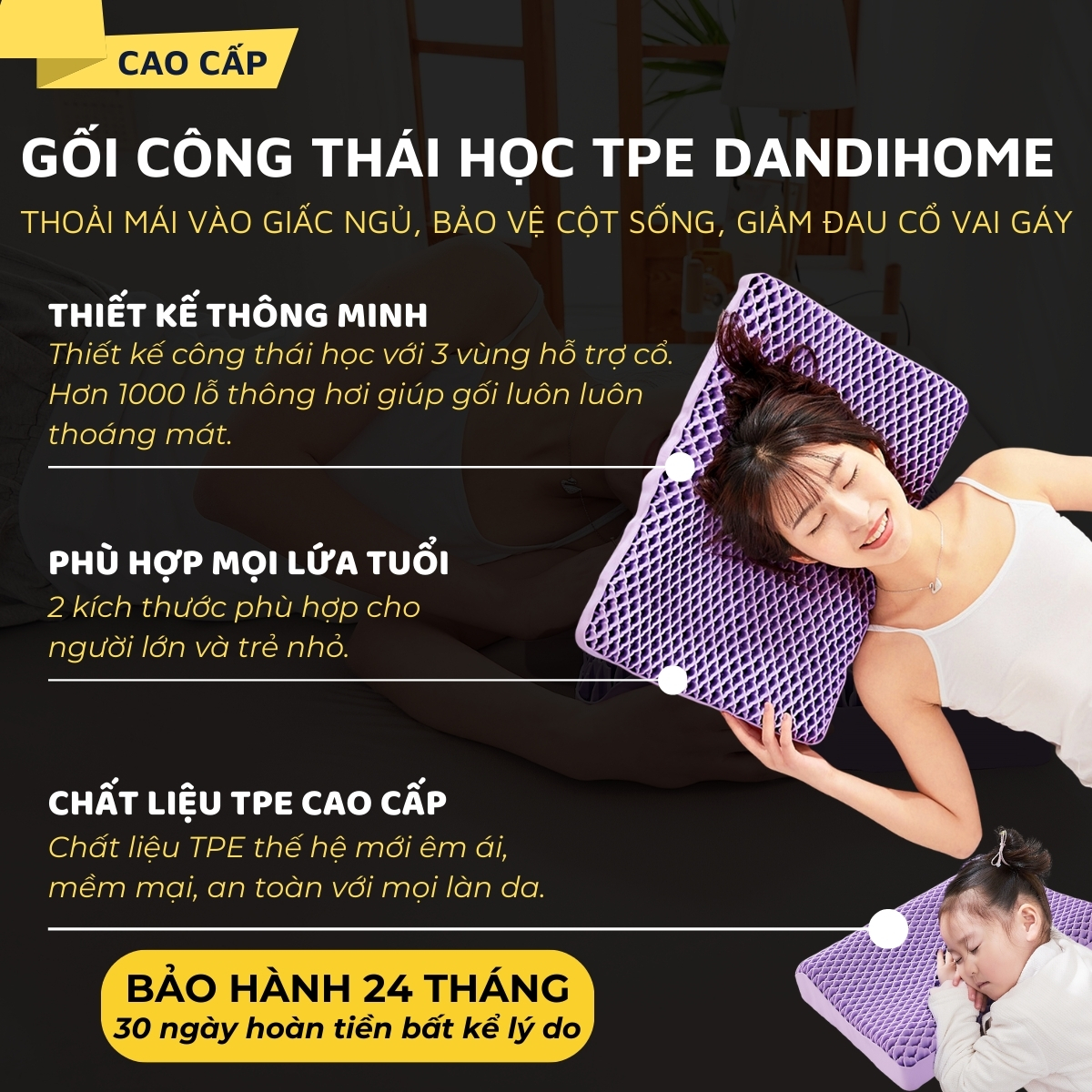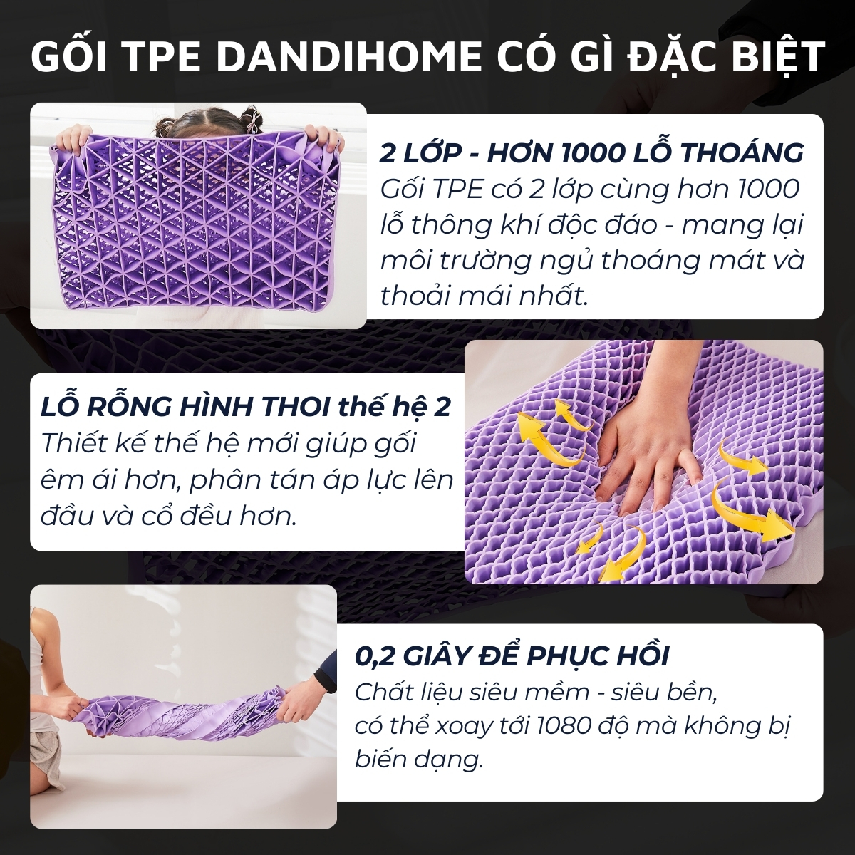 Mua tại TiktokGối công thái học TPE (Thermoplastic Elastomer) có nhiều đặc điểm vượt trội so với gối cao su non (Latex Foam) trước đây. (!) LƯU Ý: Trong 30 ngày nằm thử gối, Quý Khách vui lòng giữ lại vỏ và nilon bọc gối. DandiHome có thể từ chối hoàn tiền, nếu Quý Khách không giữ lại bao bì sản phẩm nguyên vẹn như ban đầu. Xin cám ơn. Hãy cùng DandiHome tìm hiểu! So sánh gối công thái học TPE thế hệ 2 của DandiHome với gối thông thường, gối cao su non… Gối công thái học TPE thế hệ 2 tại DandiHome Với nhiều ưu điểm, gối công thái học TPE đang được rất nhiều người quan tâm: