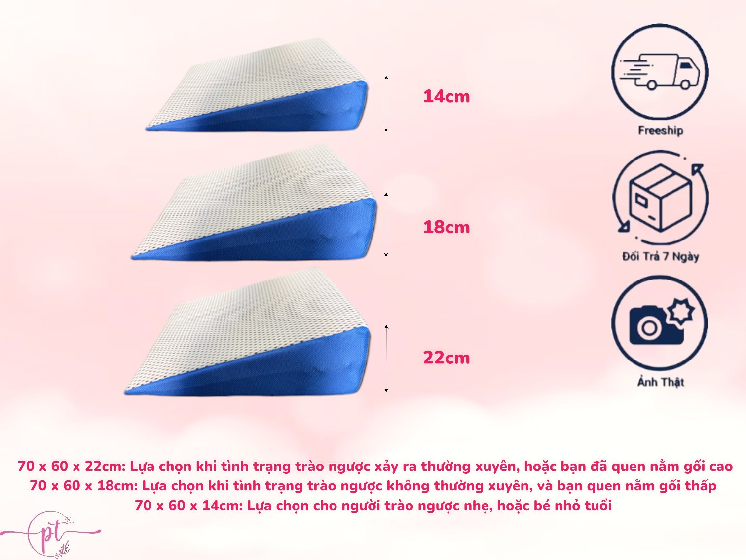 Kích thước 70 x 60 x 14cm: Lựa chọn cho người trào ngược nhẹ, hoặc bé nhỏ tuổi.