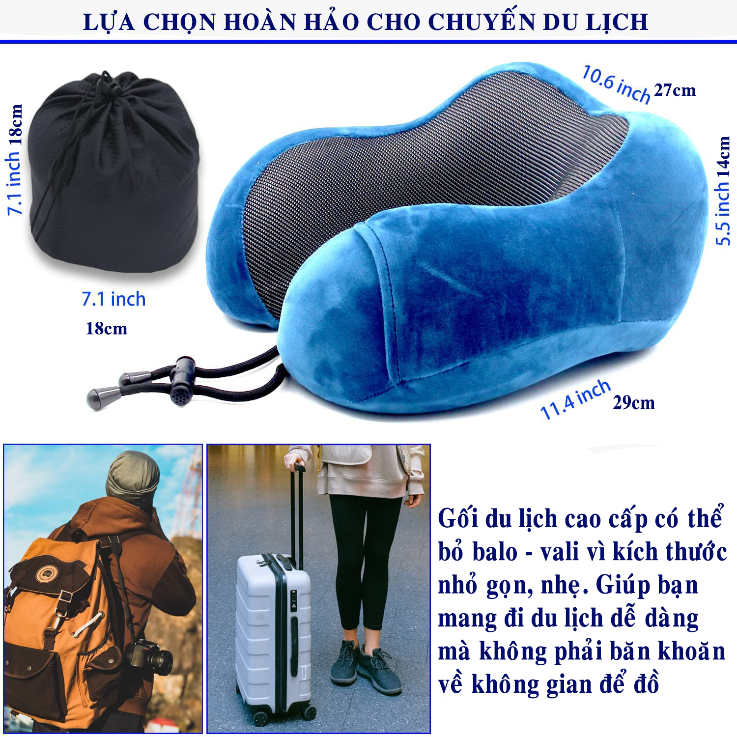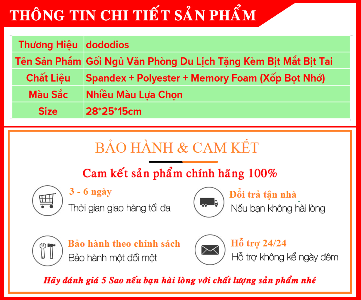 Gối ngủ có thể hồi phục lại hình dáng ban đầu chỉ sau 3-5s khi có tác dụng lực vào gối – rất tiện lợi và êm ái Chiếc gối ngủ du lịch thông minh dành cho những người thường xuyên đi công tác hay du lịch trên các phương tiện giao thông như máy bay, tàu hoả, xe bus, xe hơi. Chi tiết bộ gối ngủ du lịch văn phòng cao cấp Kích thước gối ngủ du lịch văn phòng cao cấp