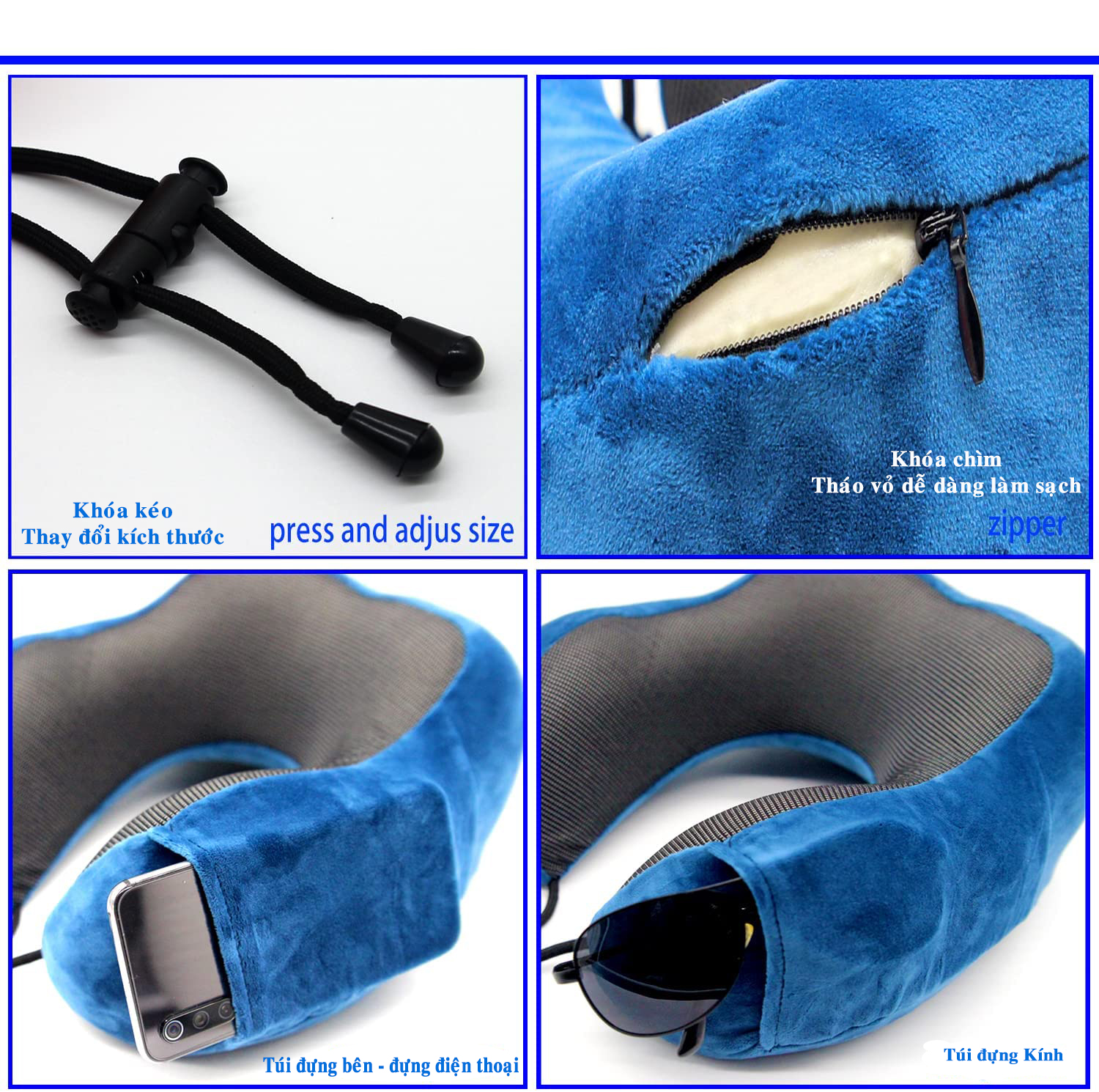 Gối Ngủ du lịch văn phòng có thiết kế khóa cài để điều chỉnh size gối cho vừa cổ người đeo – Freesize phù hợp với tất cả mọi người – điều chỉnh bằng khóa cài phía dưới.