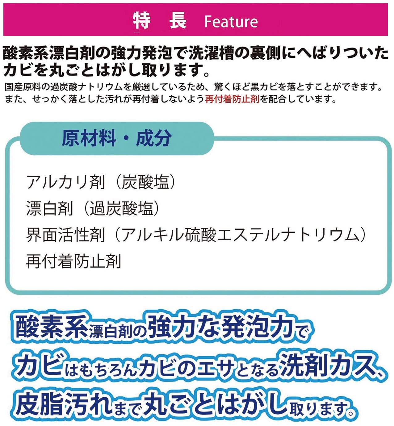 - Hoạt chất kiềm (cacbonat), chất tẩy trắng (percarbonate), chất hoạt động bề mặt (natri alkyl sulfat), chất chống tái lắng, chất làm sạch gốc oxy thân thiện với môi trường. ■ Công dụng: