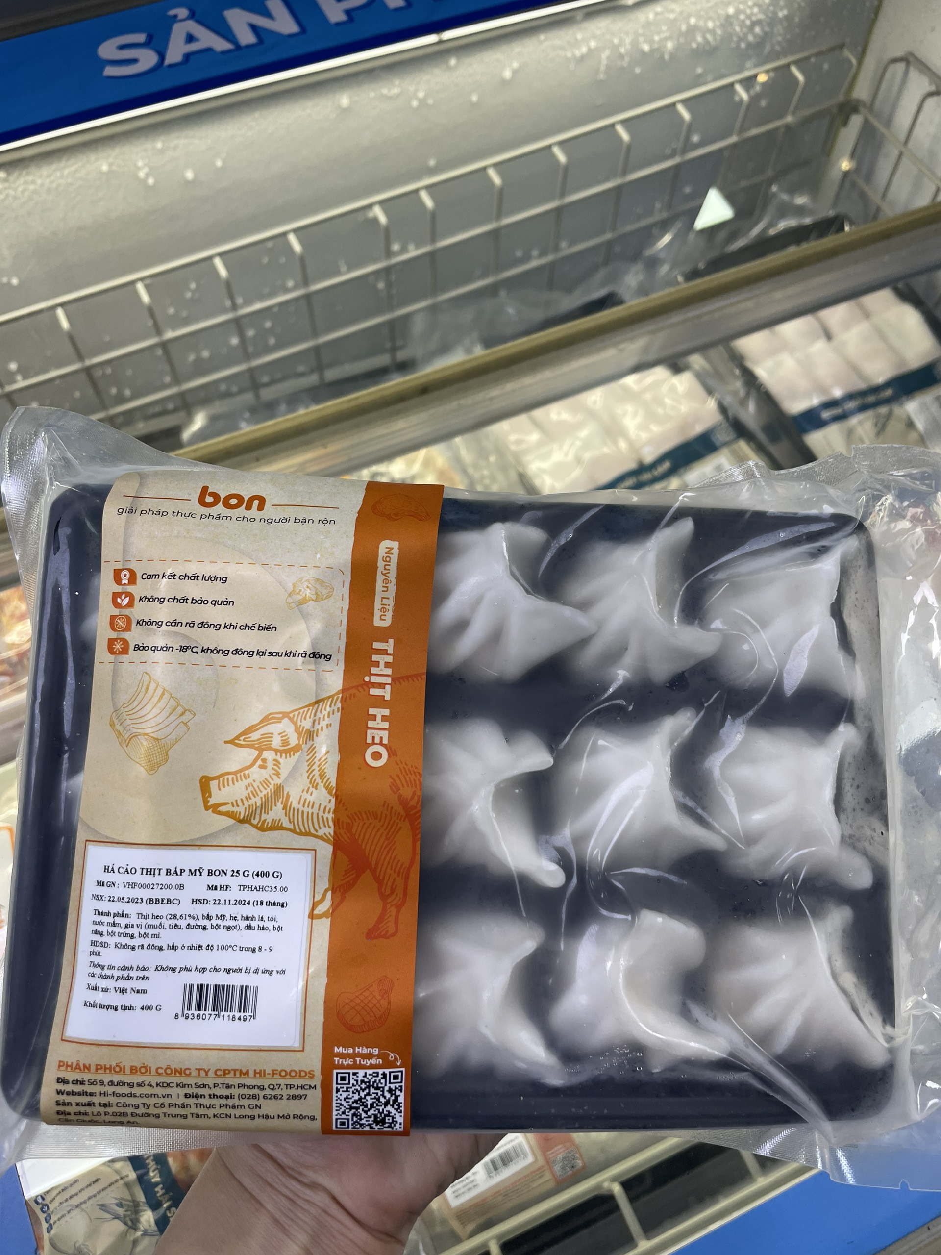 Mua tại TiktokVới sản phẩm tươi sống, trọng lượng thực tế có thể chênh lệch khoảng 10%. ĐỊNH LƯỢNG: 400g/gói THÀNH PHẦN: Thịt heo (28,61%), bắp Mỹ, hẹ, hành lá, tỏi,nước mắm, gia vị (muối, tiêu, đường, bột ngọt), dầu hào, bột năng, bột trứng, bột mì MÔ TẢ SẢN PHẨM: - Vỏ áo ngoài màu trắng trong, thấy được nhân màu đặc trưng của thịt heo, màu vàng của bắp mỹ tươi - Vỏ bánh mỏng, mềm mịn dẻo dai với phần nhân từ thịt heo, bắp mỹ tươi - Ăn kèm với nước chấm Dimsum CÁCH CHẾ BIẾN: - Không rã đông - Hấp ở nhiệt độ 100 độ C trong thời gian 8 - 9 phút BẢO QUẢN: Bảo quản -18oC, không đông lại sau khi rã đông HSD: 18 tháng